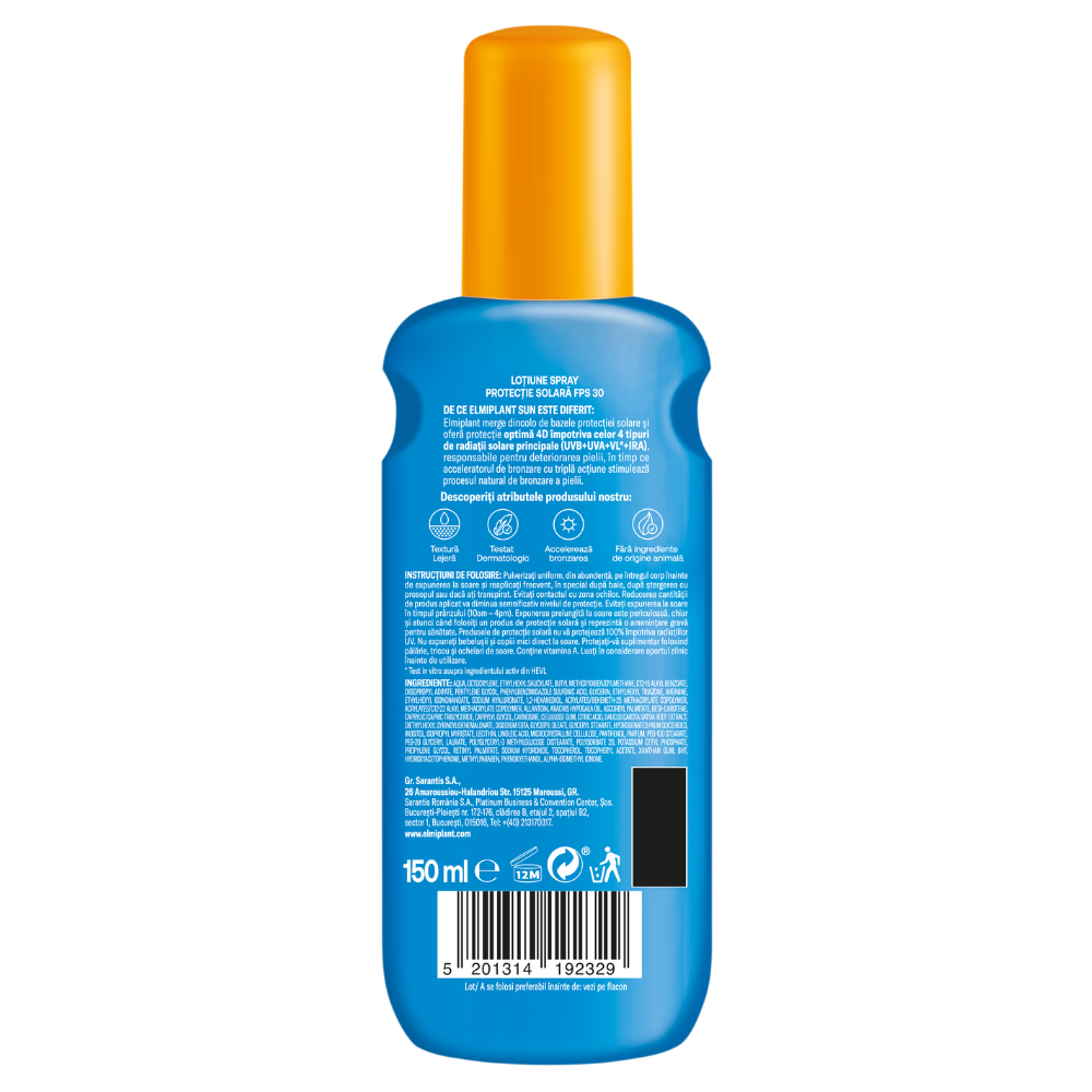 Elmiplant Tan & Protect SPF30 este o lotiune spray pentru protectie solara, ce combina protectia avansata 4D impotriva radiatiilor (UVB, UVA, lumina vizibila si IR-A) cu un accelerator de bronzare cu tripla actiune. Hidrateaza pielea si sustine obtinerea unui bronz uniform si natural.