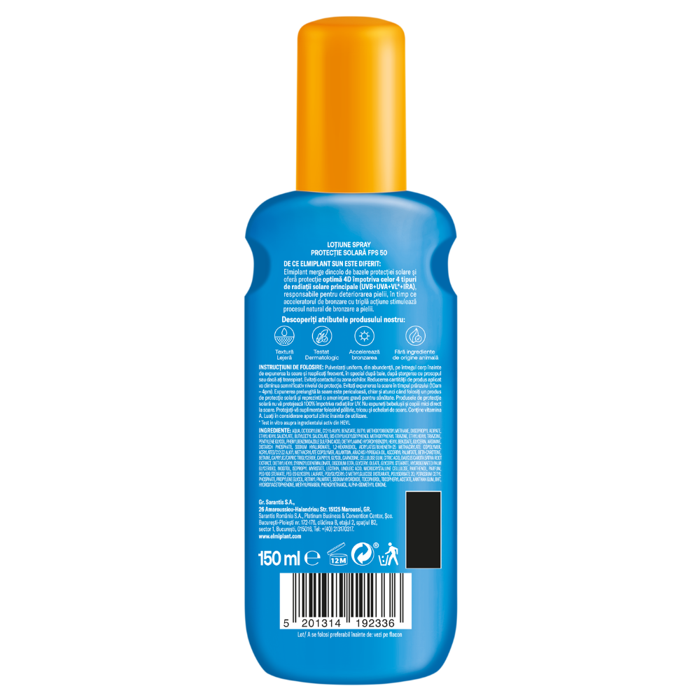 Elmiplant Tan & Protect SPF50 este o lotiune spray pentru protectie solara foarte ridicata, care combina protectia avansata 4D impotriva radiatiilor solare cu un accelerator de bronzare. Protejeaza eficient pielea si sustine obtinerea unui bronz uniform si natural.