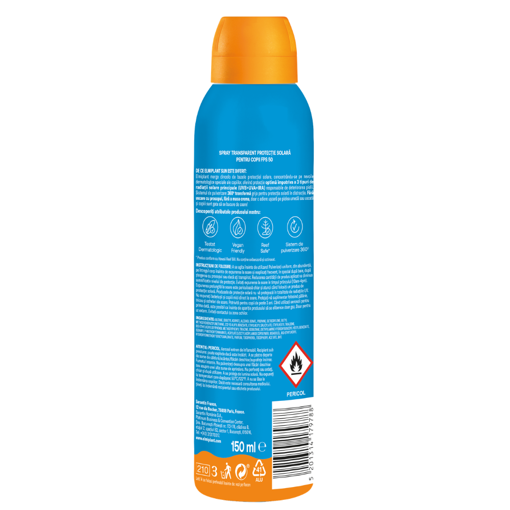 Elmiplant Wetskin SPF50 este o lotiune spray de protectie solara special creata pentru pielea sensibila a copiilor, oferind protectie ridicata impotriva radiatiilor UVA, UVB si IR-A. Formula inovatoare permite aplicarea atat pe pielea uscata, cat si pe pielea umeda, fara a lasa urme albe.