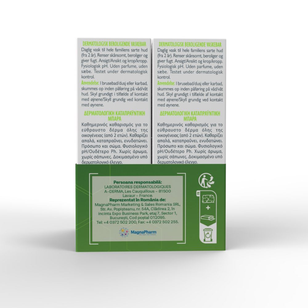 Formulată special pentru curățarea zilnică a pielii fragile a întregii familii (începând de la vârsta de 2 ani), pâinea dermatologică A-Derma curăță delicat, calmează și hidratează pielea, respectând echilibrul său natural.