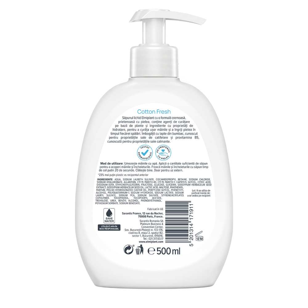 Săpunul lichid cremă Elmiplant Cotton Fresh este conceput pentru curățarea delicată a mâinilor, oferind în același timp hidratare și îngrijire pielii la fiecare spălare. Formula sa cremoasă conține agenți de curățare pe bază de plante și este realizată cu 93% ingrediente de origine naturală, fiind prietenoasă cu pielea.