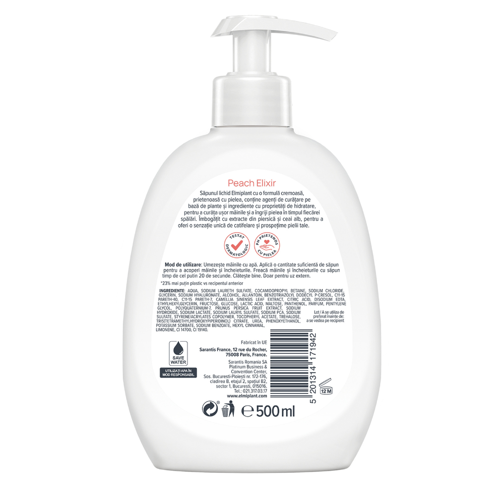 sapun lichid crema elmiplant peach elixir, cu extract de piersica si ceai alb, curata delicat si hidrateaza pielea mainilor