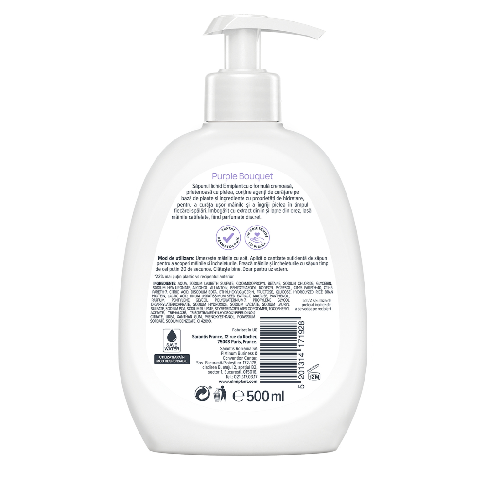 Săpunul lichid cremă Elmiplant Purple Bouquet este conceput pentru curățarea delicată a mâinilor, oferind în același timp hidratare și îngrijire pielii la fiecare utilizare. Formula sa cremoasă conține 93% ingrediente de origine naturală și agenți de curățare pe bază de plante, contribuind la o curățare eficientă și delicată.