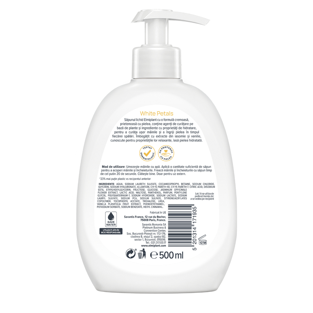 Ultima actualizare a informatiilor de prezentare pentru Sapun lichid crema White Petals, Iasomie si Vanilie, 500 ml, Elmiplant a fost efectuata la data de 16-04-2026.  |  Raporteaza Descriere Gresita