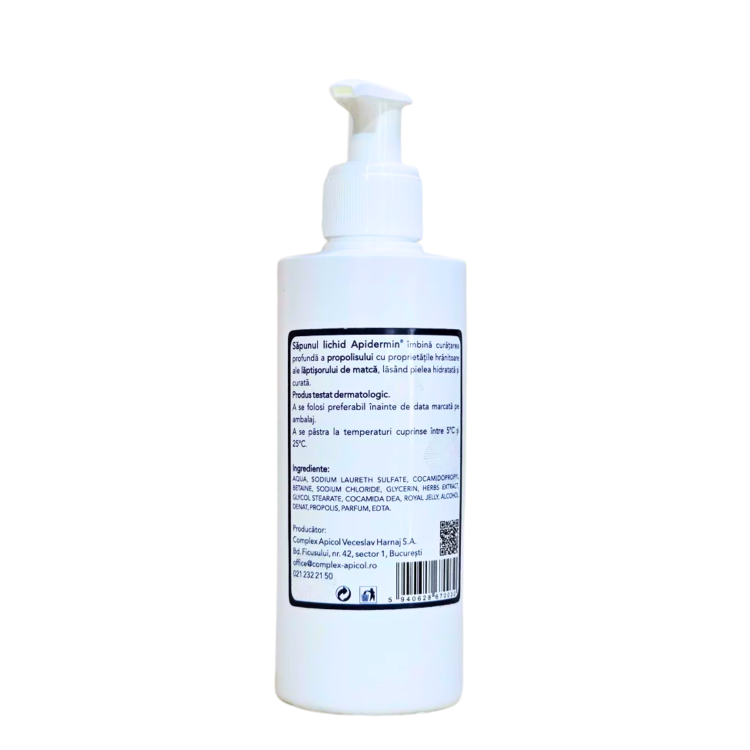 Răsfață-ți mâinile cu prospețimea naturii prin Apidermin Sapun Lichid cu lăptișor de matcă și propolis – o formulă ce combină puterea regeneratoare a lăptișorului de matcă (bogat în vitamine B, C, D, E, lipide și carbohidrați) cu acțiunea antiseptică și antibacteriană a propolisului.