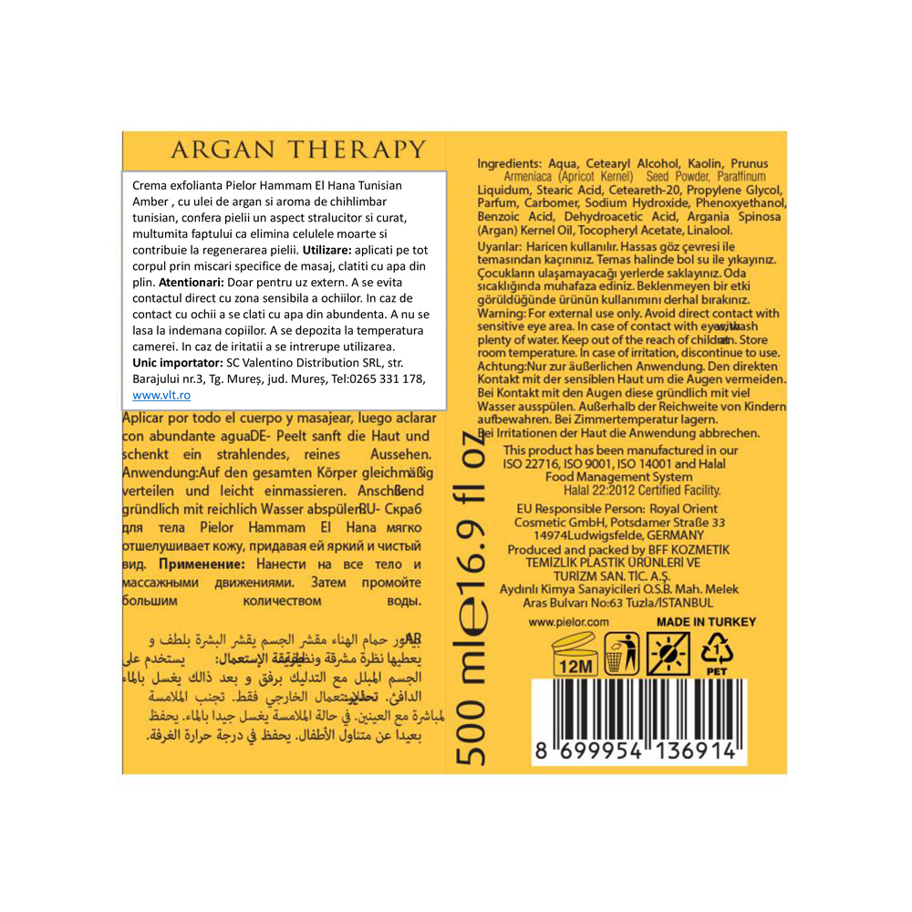 Crema exfolianta pentru corp Pielor Hammam imbogatita cu vitamine si nutrienti benefici pielii, contine ulei de argan folositor pentru imbunatatirea aspectului pielii uscate