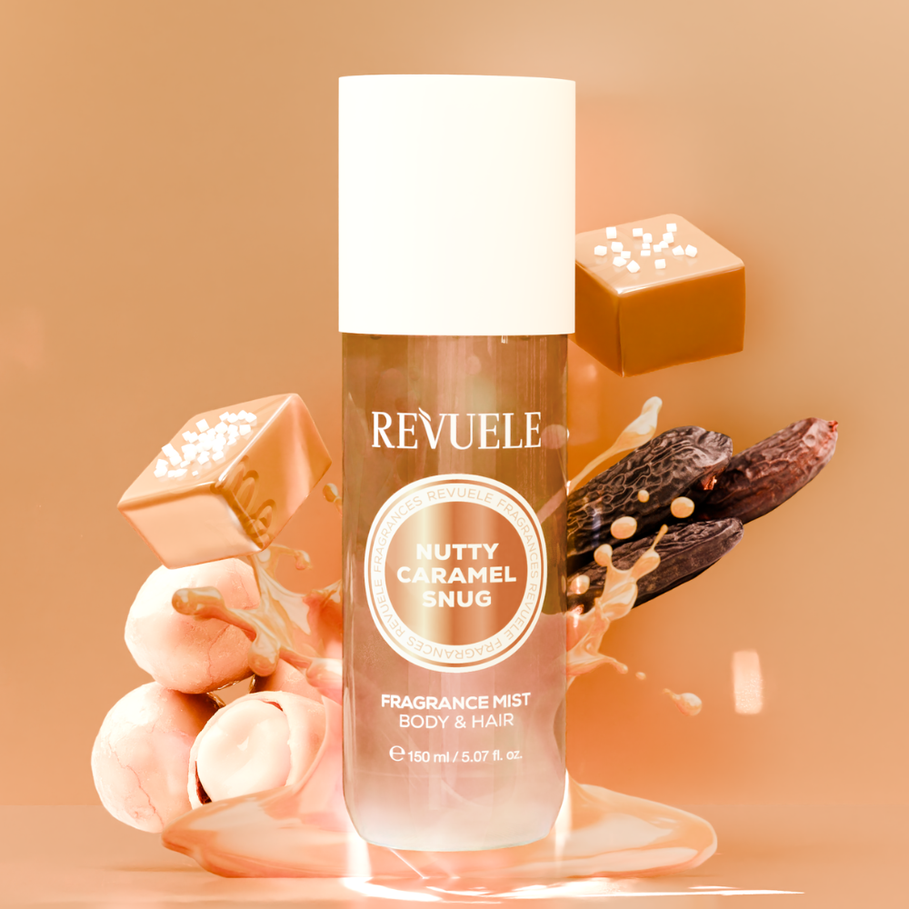 Bucură-te de aroma dulce și răsfățată a nucilor de macadamia, caramelului sărat și boabelor de tonka cu spray-ul parfumat Revuele Nutty Caramel Snug. Această ceață delicată învăluie ușor pielea, lăsând o senzație de prospețime și un parfum cald, gurmand și persistent.