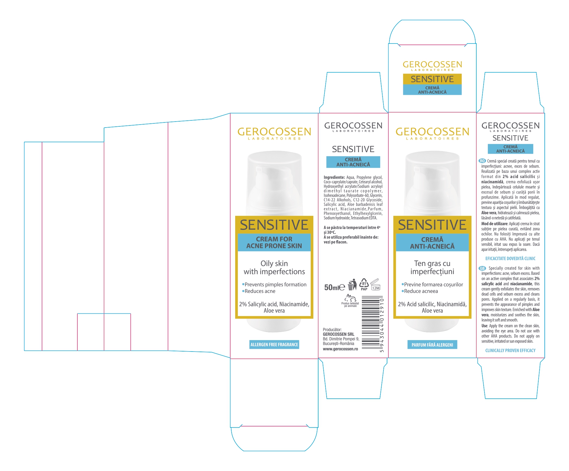 Crema anti-acneica 2% Acid Salicilic, Niacinamida si Aloe Vera Sensitive, 50 ml, Gerocossen [5943044012910]