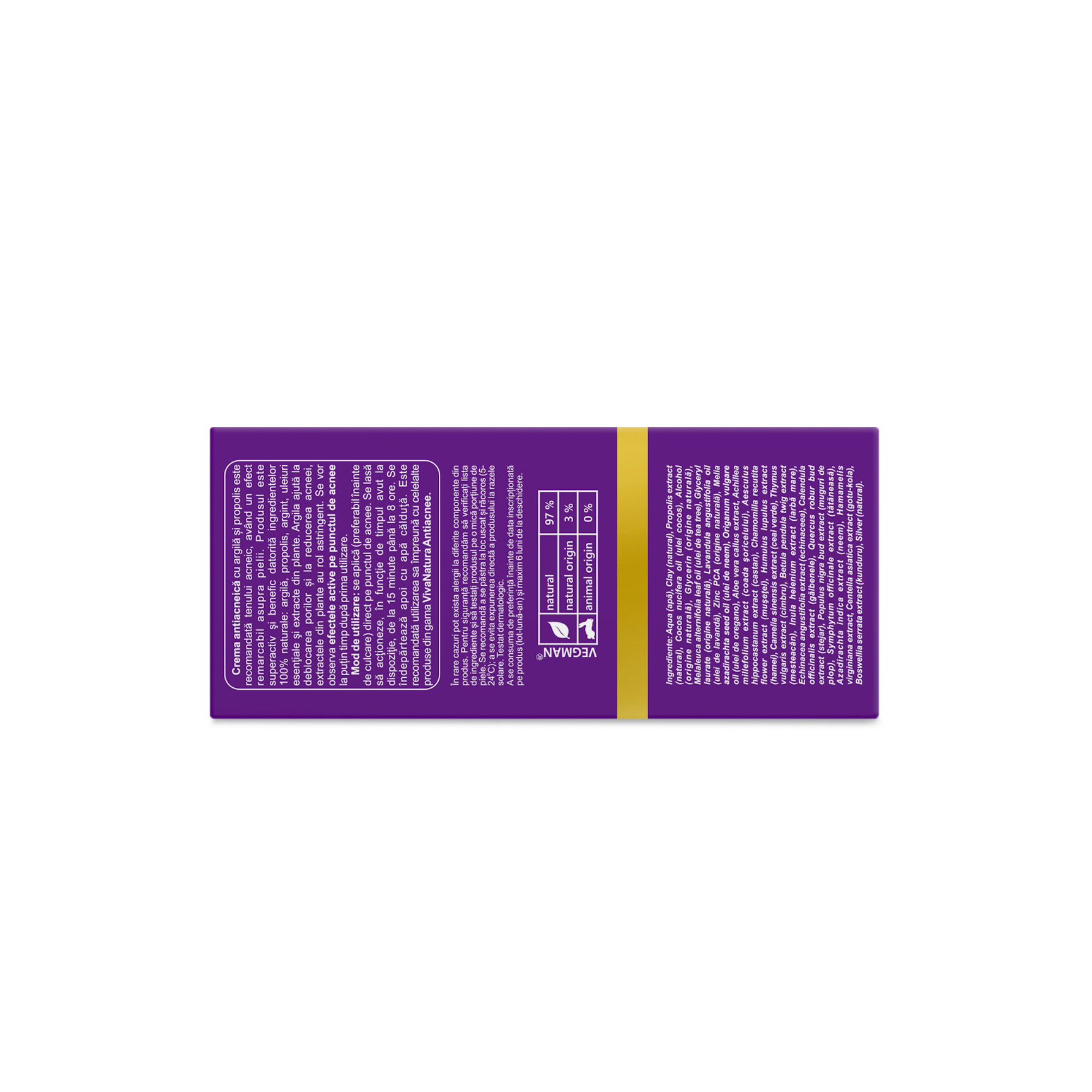 Aqua (apă), Clay (natural), Propolis extract (natural), Cocos nucifera oil (ulei cocos), Alcohol (origine naturală), Glycerin (origine naturală), Melaleuca alternifolia leaf oil (ulei de tea tree), Glyceryl laurate (origine naturală), Lavandula angustifolia oil (ulei de lavandă), Zinc PCA (origine naturală), Melia azadirachta seed oil (ulei de neem), Origanum vulgare oil (ulei de oregano), Aloe vera callus extract, Achillea millefolium extract (coada şoricelului), Aesculus hippocastanum extract (castan), Chamomilla recutita flower extract (muşeţel), Humulus lupulus extract (hamei), Camelia sinensis extract (ceai verde), Thymus vulgaris extract (cimbru), Betula pendula twig extract (mesteacăn), Inula helenium extract (iarbă mare), Echinacea angustifolia extract (echinaceea), Calendula officinalis extract (gălbenele), Quercus robur bud extract (stejar), Populus nigra bud extract (muguri de plop), Symphytum officinale extract (tǎtǎneasă), Azadirachta indica extract (neem), Hamamelis virginiana extract, Centella asiatica extract (gotu-kola), Boswellia serrata extract (kunduru), Silver (natural).