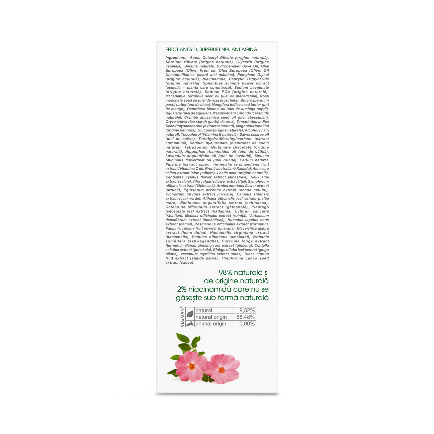 Aqua (apă), Cetearyl olivate (and) Sorbitan olivate (din ulei de măsline), Caprylic / Capric Triglyceride (natural origin), Glycerin (and) Aqua (and) Sodium levulinate (and) Sodium anisate (natural origin), Vitis vinifera seed oil (ulei de sâmburi de struguri), Caprylic / Capric Triglyceride (and) Spilanthes acmella flower extract (natural origin), Squalene oil (ulei squalan), Glycerine, Glycerin (and) Water (and) Alcohol denat (and) Terminalia ferdinandiana fruit extract (natural origin), Prunus amygdalus dulcis (ulei de migdale), Tocopherol (natural vitamin E), Rosa moschata seed oil (ulei de roza mosqueta), Tamarindus indica seed polysaccharide (and) Glucose (tamarind), Sodium hyaluronate (natural), Butyrospermum parkii butter (unt de shea), Limnanthes alba seed oil (meadowstolide – ulei), Crambe abyssinica seed oil (ulei abyssinian), Tetrahydrodiferuloylmethane (din turmeric), Oenothera biennis oil (ulei de luminița nopții), Borago officinalis seed oil (ulei de limba mielului), Hippophae rhamnoides oil (ulei de catină), Theobroma cacao seed butter (unt de cacao), Simmondsia chinensis seed oil (ulei de jojoba), Macadamia seed oil (ulei de macadamia), Cocos nucifera oil (ulei de cocos), Daucus carota sativa root extract (ulei de morcov), Alcohol denat. (alchool etilic), Aloe vera callus extract, Juniperus communis L.wood oil (ulei de iasomie), Retinol (natural), Lactic acid (natural origin), Tetrahydropiperine (din piper negru), Cymbopogon flexuosus oil (ulei de lemon grass), Centaurea cyanus flower extract (albăstrele), Salix alba extract (salcie), Tilia vulgaris flower extract (tei), Symphytum officinale extract (tătăneasă), Arnica montana flower extract (arnică), Equisetum arvense extract (coada calului), Cichorium intybus extract (cicoare), Camelis sinensis extract (ceai verde), Althaea officinalis leaf extract (nalbă mare), Echinacea angustifolia extract (echinacea), Calendula officinalis extract (gălbenele), Plantago lanceolata leaf extract (pătlagină), Lythrum salicaria (răchitan), Melissa officinalis extract (roiniță), Verbascum densiflorum extract (lumânărică), Humulus lupulus cone extract (hamei), Rosmarinus officinallis extract (rozmarin), Paullinia cupana fruit powder (guarana), Glycyrrhiza glabra extract (lemn dulce), Hamamelis virginiana extract (hamamelis), Emblica officinalis (amalakhi), Withania somnifera (ashwagandha), Curcuma longa extract (turmeric), Panax ginseng root extract (ginseng), Centella asiatica extract (gotu kola), Ginkgo biloba leaf extract (gingo biloba), Vaccinum myrtillus extract (afine), Ribes nigrum fruit extract (stafide negre), Theobroma cacao seed extract (cacao).