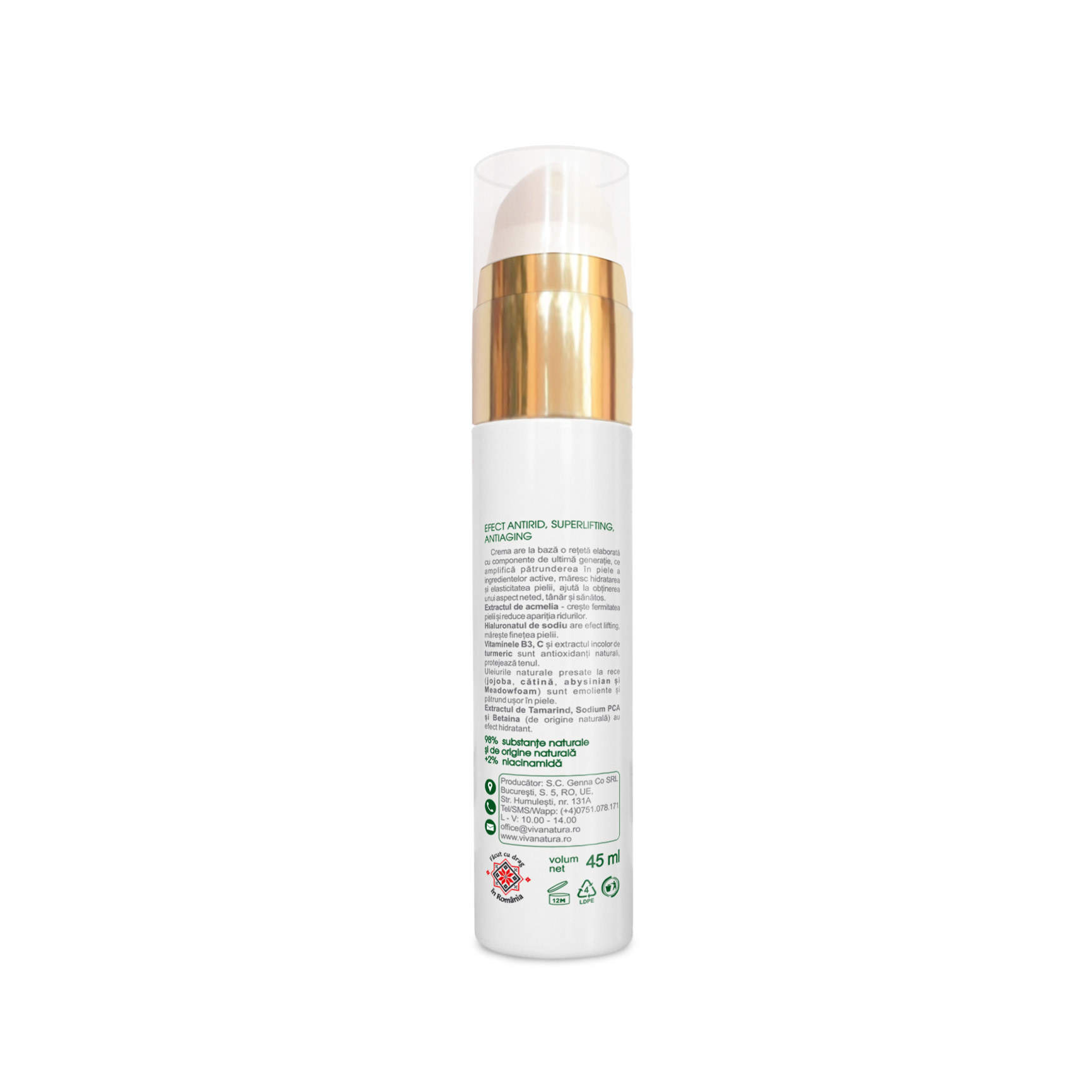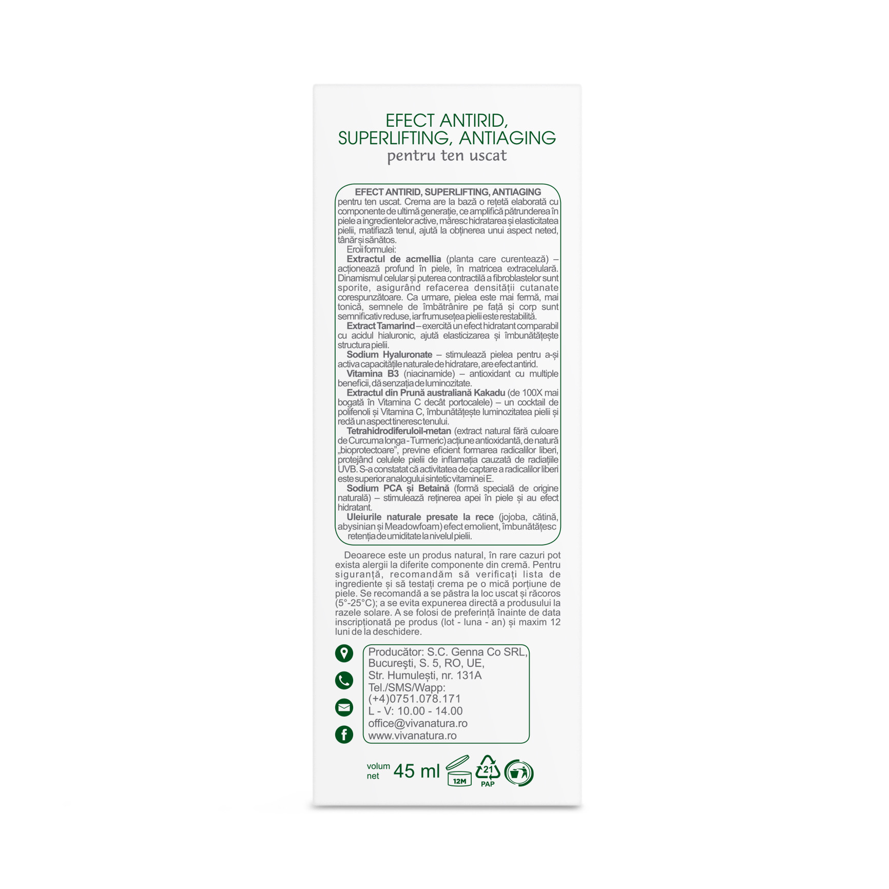 Ultima actualizare a informatiilor de prezentare pentru Crema antirid pentru ten uscat Superlifting, 45 ml, Vivanatura a fost efectuata la data de 01-04-2026.  |  Raporteaza Descriere Gresita