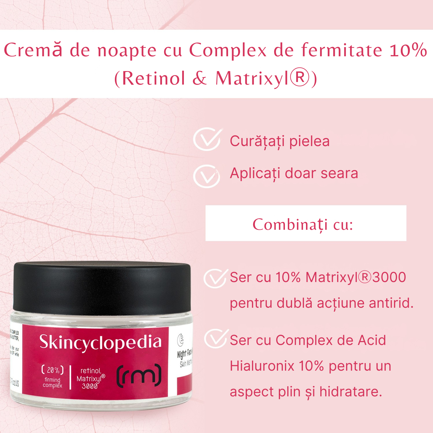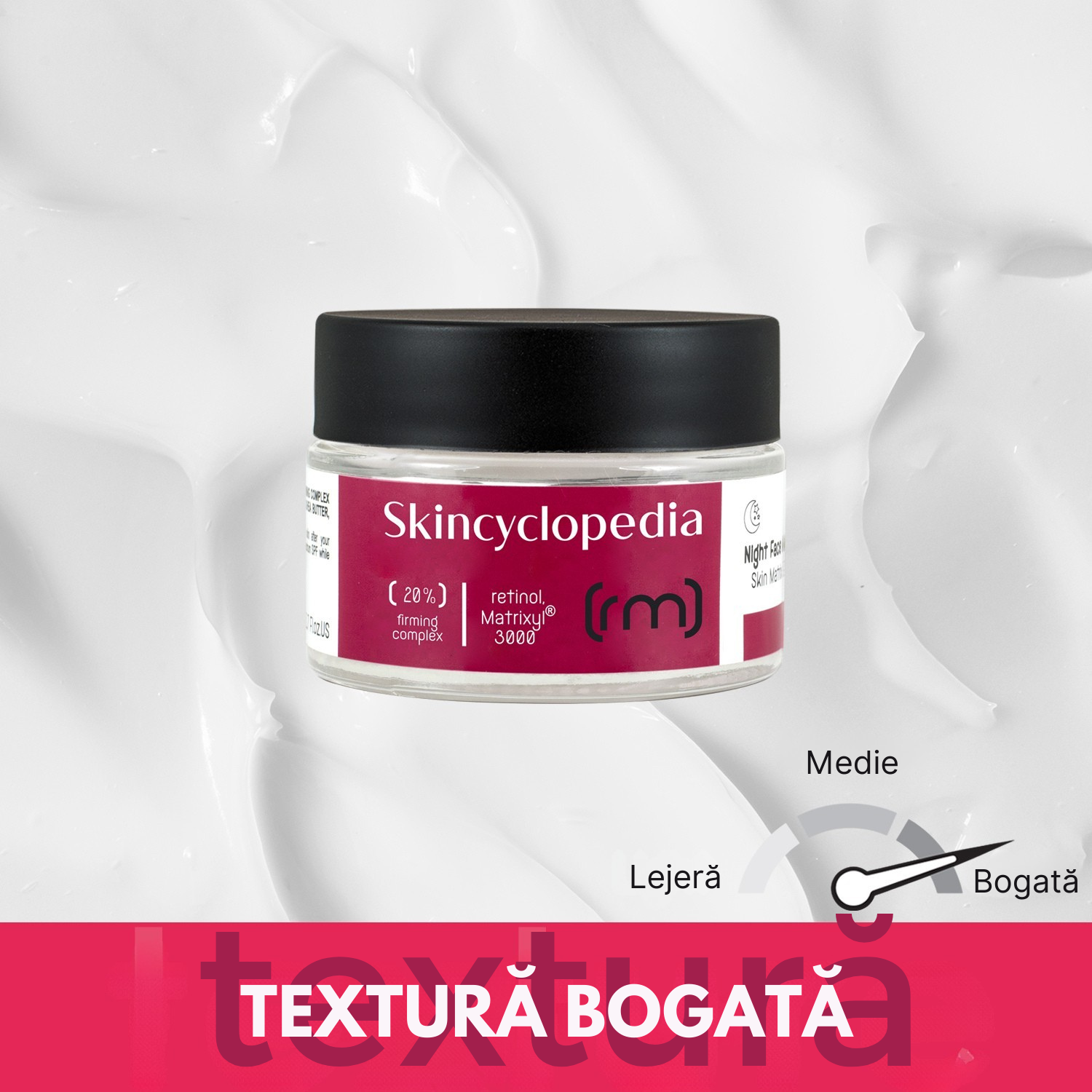 Cremă de noapte cu 20% complex de fermitate, îmbogățită cu Retinol, Matrixyl®3000 și squalane pentru o piele vizibil mai fermă, hidratată și luminoasă. Ideală pentru ten matur, cu riduri fine și pete pigmentare.