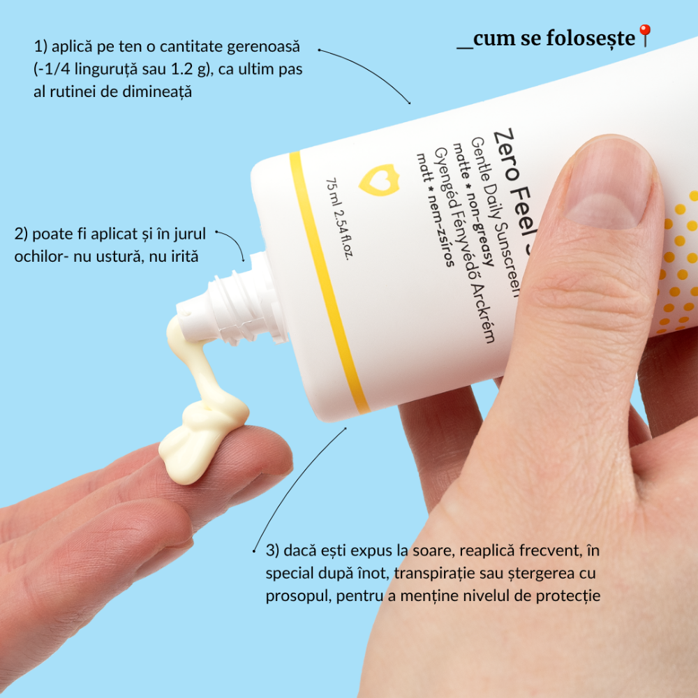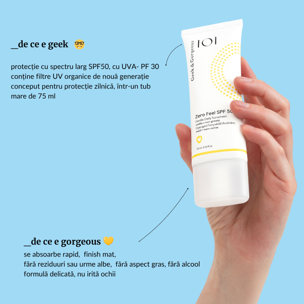 Zero Feel SPF 50 este o protectie solara de ultima generatie, cu spectru larg, formulata pentru utilizare zilnica. Textura ultra-lejera, cu absorbtie rapida, ofera un finisaj mat, non-gras si o senzatie invizibila pe piele, fiind ideala inclusiv pentru pielea sensibila.