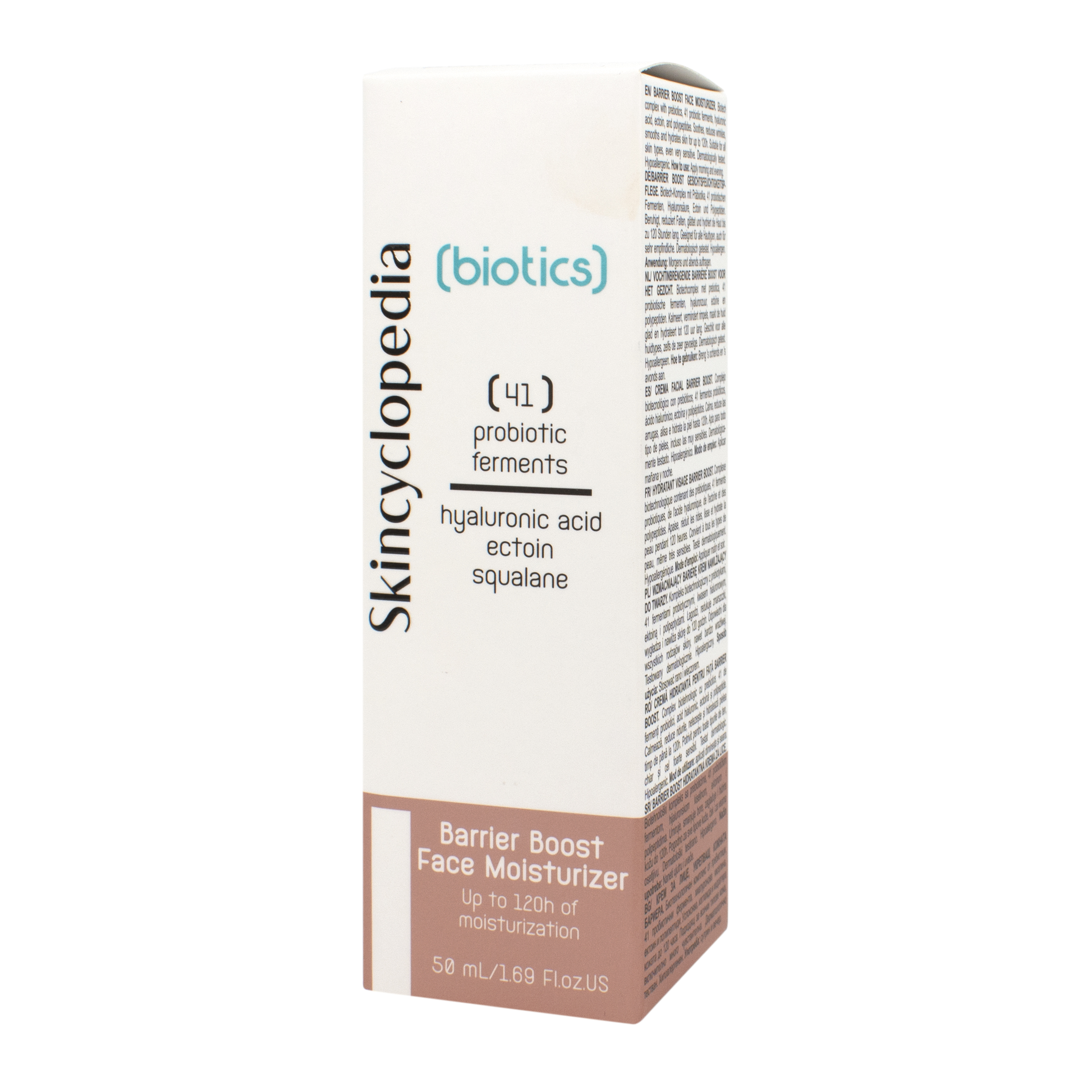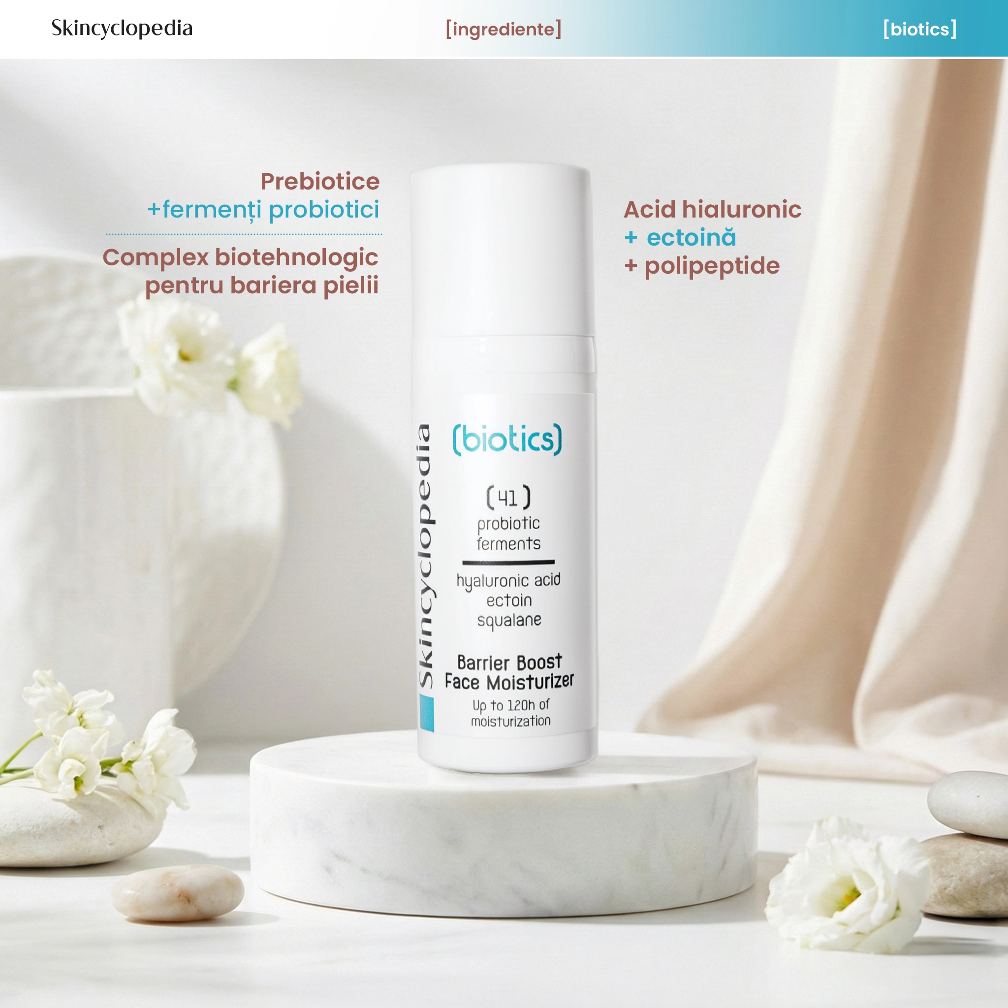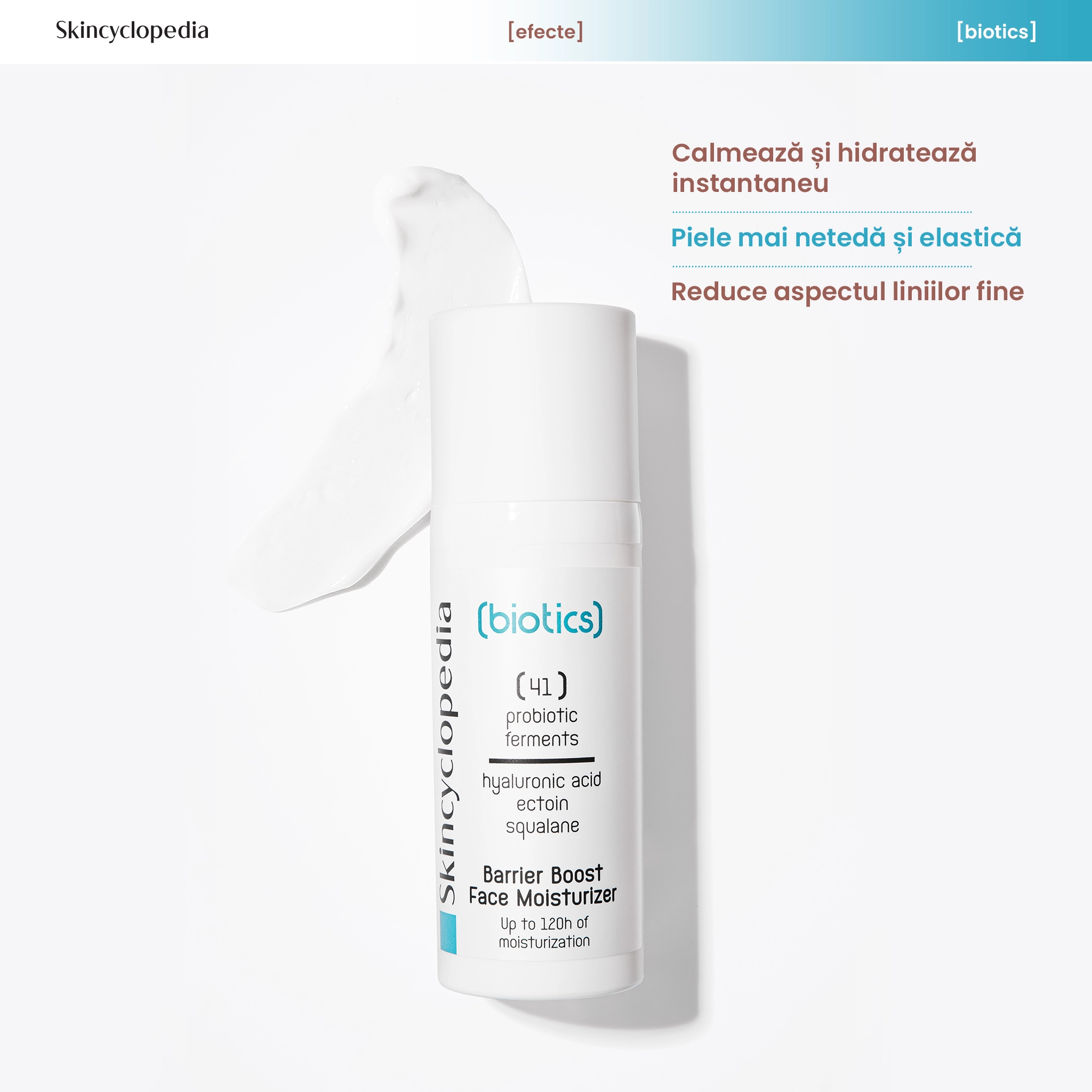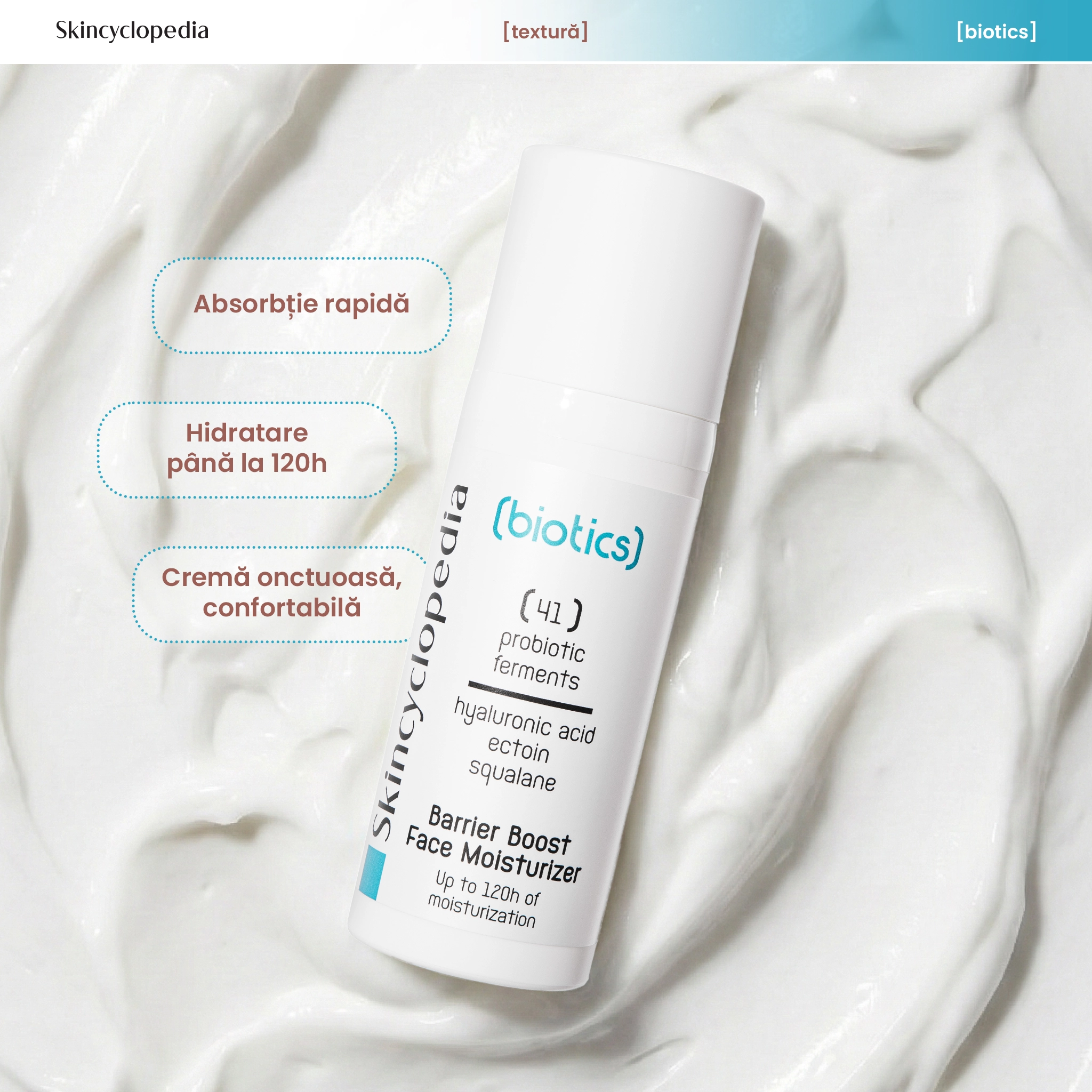 Crema SKC Biotics Barrier de la Skincyclopedia este o formulă biotehnologică avansată, cu 41 de fermenti probiotici și prebiotici, acid hialuronic, ectoină și squalane. Oferă hidratare intensivă până la 120 de ore, reface bariera pielii și protejează împotriva agresorilor externi. Ideală pentru pielea sensibilă, uscată sau matură, contribuie la reducerea roșeții, estomparea liniilor fine și întărirea microbiomului cutanat.