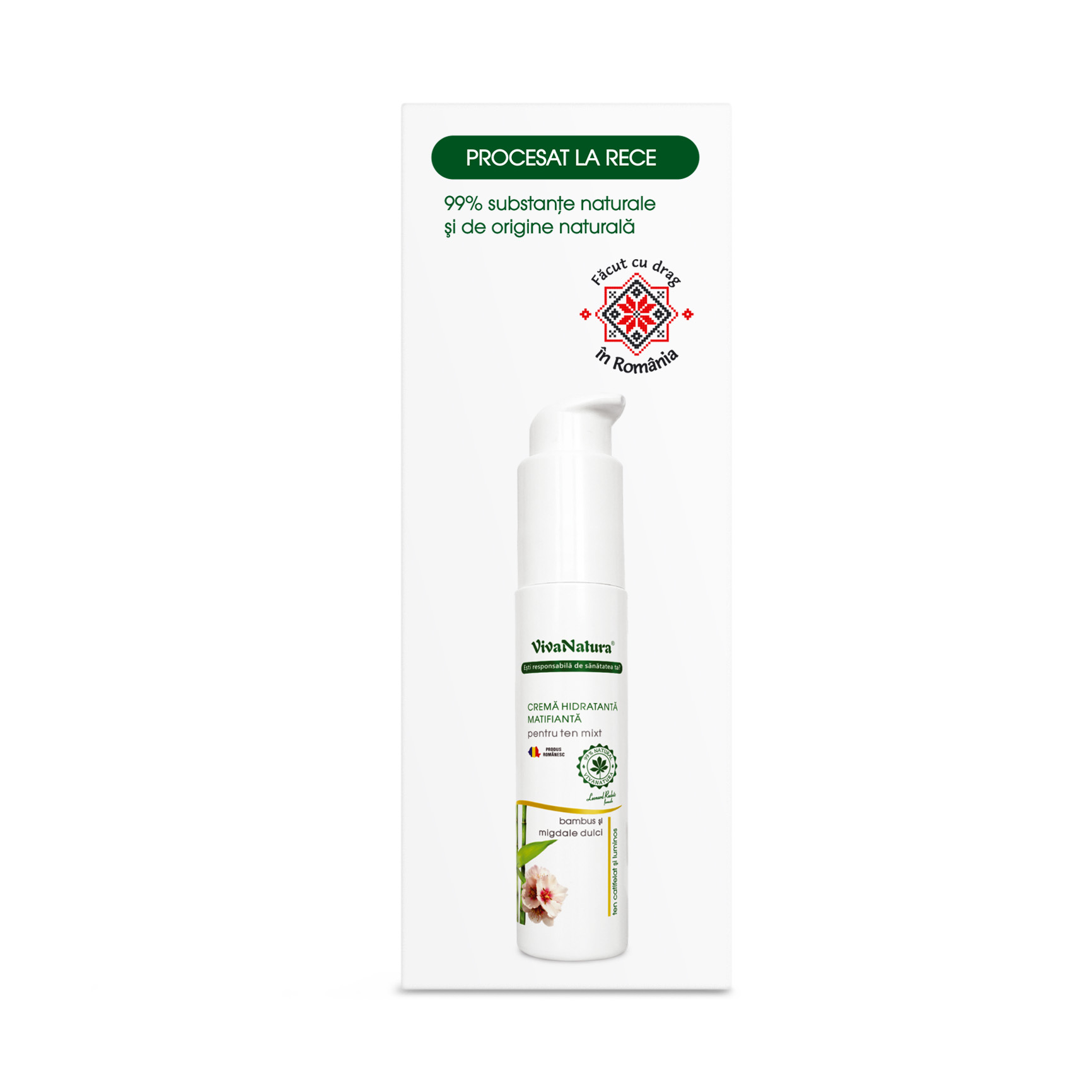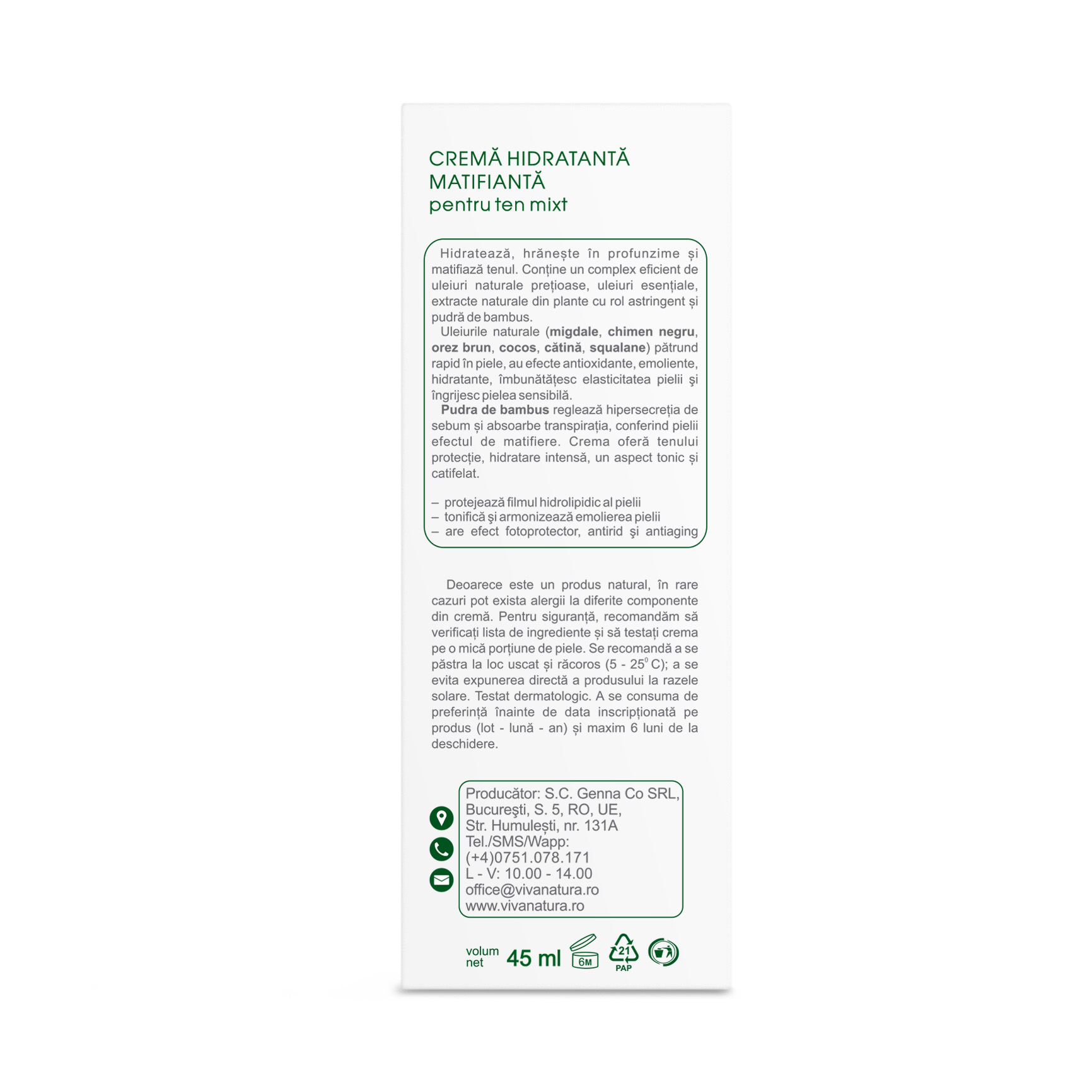 Hidratează, hrănește în profunzime și matifiază tenul. Conține un complex eficient de uleiuri naturale prețioase, uleiuri esențiale, extracte naturale din plante cu rol astringent şi pudră de bambus.