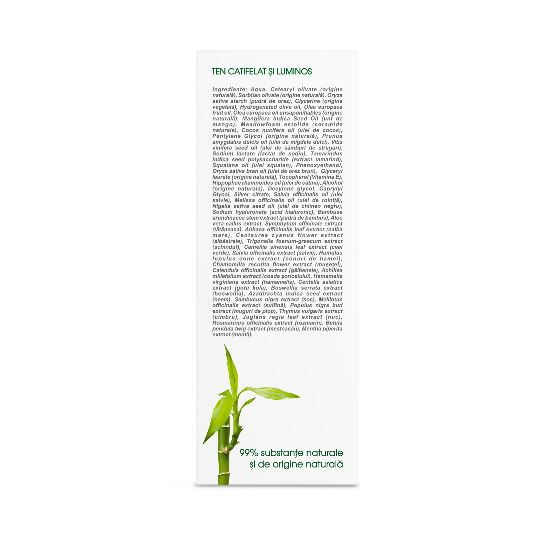 Aqua, Cetearyl olivate (origine naturală), Sorbitan olivate (origine naturală), Oryza sativa starch (pudră de orez), Glycerine (origine vegetală), Hydrogenated olive oil, Olea europaea fruit oil, Olea europaea oil unsaponifiables (origine naturală), Mangifera Indica Seed Oil (unt de mango), Meadowfoam estolide (ceramide naturale), Cocos nucifera oil (ulei de cocos), Pentylene Glycol (origine naturală), Prunus amygdalus dulcis oil (ulei de migdale dulci), Vitis vinifera seed oil (ulei de sâmburi de struguri), Sodium lactate (lactat de sodiu), Tamarindus indica seed polysaccharide (extract tamarind), Squalane oil (ulei squalan), Phenoxyethanol, Oryza sativa bran oil (ulei de orez brun), Glyceryl laurate (origine naturală), Tocopherol (Vitamina E), Hippophae rhamnoides oil (ulei de cătină), Alcohol (origine naturală), Decylene glycol, Caprylyl Glycol, Silver citrate, Salvia officinalis oil (ulei salvie), Melissa officinalis oil (ulei de roiniță), Nigella sativa seed oil (ulei de chimen negru), Sodium hyaluronate (acid hialuronic), Bambusa arundinacea stem extract (pudră de bambus), Aloe vera callus extract, Symphytum officinale extract (tătăneasă), Althaea officinalis leaf extract (nalbă mare), Centaurea cyanus flower extract (albăstrele), Trigonella foenum-graecum extract (schinduf), Camellia sinensis leaf extract (ceai verde), Salvia officinalis extract (salvie), Humulus lupulus cone extract (conuri de hamei), Chamomilla recutita flower extract (muşeţel), Calendula officinalis extract (gălbenele), Achillea millefolium extract (coada şoricelului), Hamamelis virginiana extract (hamamelis), Centella asiatica extract (gotu kola), Boswellia serrata extract (boswellia), Azadirachta indica seed extract (neem), Sambucus nigra extract (soc), Melilotus officinalis extract (sulfină), Populus nigra bud extract (muguri de plop), Thymus vulgaris extract (cimbru), Juglans regia leaf extract (nuc), Rosmarinus officinalis extract (rozmarin), Betula pendula twig extract (mesteacăn), Mentha piperita extract (mentă).