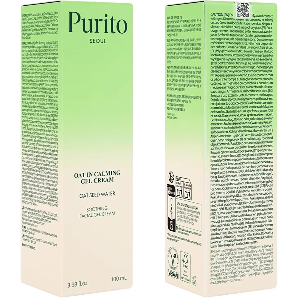 Purito Oat In Calming Gel Cream este o cremă-gel calmantă pentru ten sensibil, iritat sau reactiv, cu 77% apă din semințe de ovăz Gunsan. Textura ușoară, non-comedogenică, hidratează intens, calmează pielea supraincălzită și susține bariera cutanată, fiind potrivită pentru ten gras, mixt și predispus la acnee fungică.