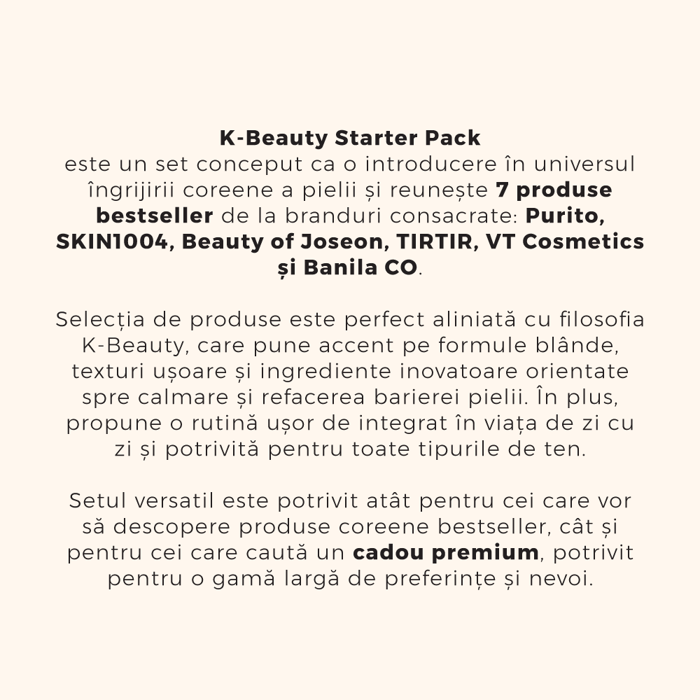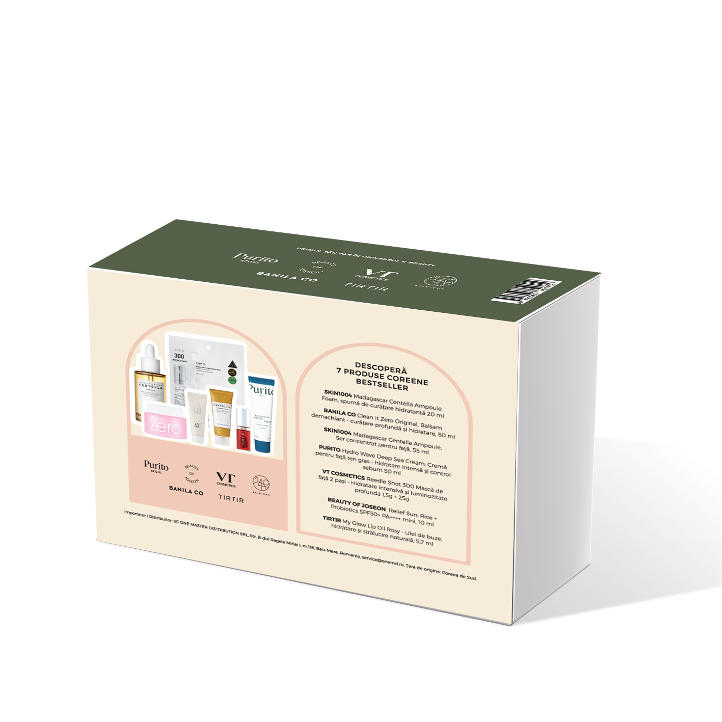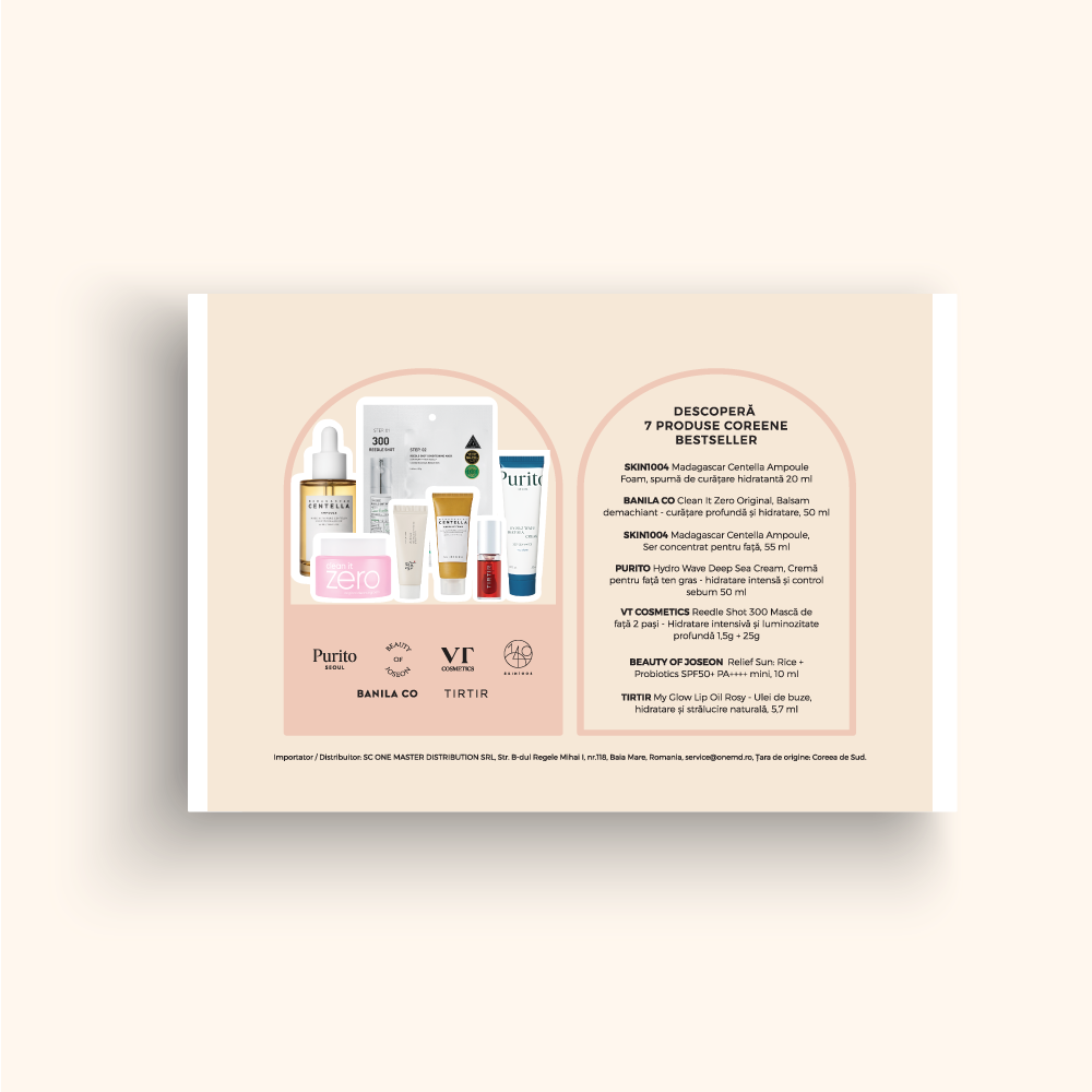 Setul de 7 produse coreene pentru ingrijirea tenului reuneste branduri iconice din universul K-Beauty – Banila Co, Purito, Skin1004, Beauty of Joseon, Tirtir si VT Cosmetics – intr-o colectie speciala conceputa pentru a oferi o rutina completa: curatare, demachiere, calmare, hidratare profunda, regenerare, protectie solara si ingrijire pentru buze. Ideal ca set starter, cadou sau mini-rutină de calatorie, acest kit aduce impreuna bestsellere formulate cu ingrediente naturale, tehnologii avansate si texturi ultra-confortabile pentru un ten echilibrat, luminos si hidratat.