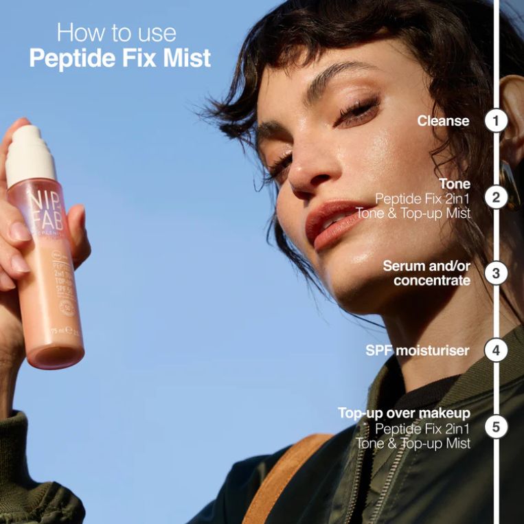 NIP+FAB Spray pentru fata 2 in 1 cu SPF50 Peptide Fix 2-in-1 Tone + Top Up Mist 4%, 75 ml este un mist multifunctional care combina hidratarea, actiunea anti-aging si protectia solara intr-un singur pas. Formula avansata cu peptide si SPF 50 ajuta la mentinerea unui ten luminos, protejat si vizibil mai neted, fiind ideal atat pentru rutina de dimineata, cat si pentru reaplicare pe parcursul zilei.