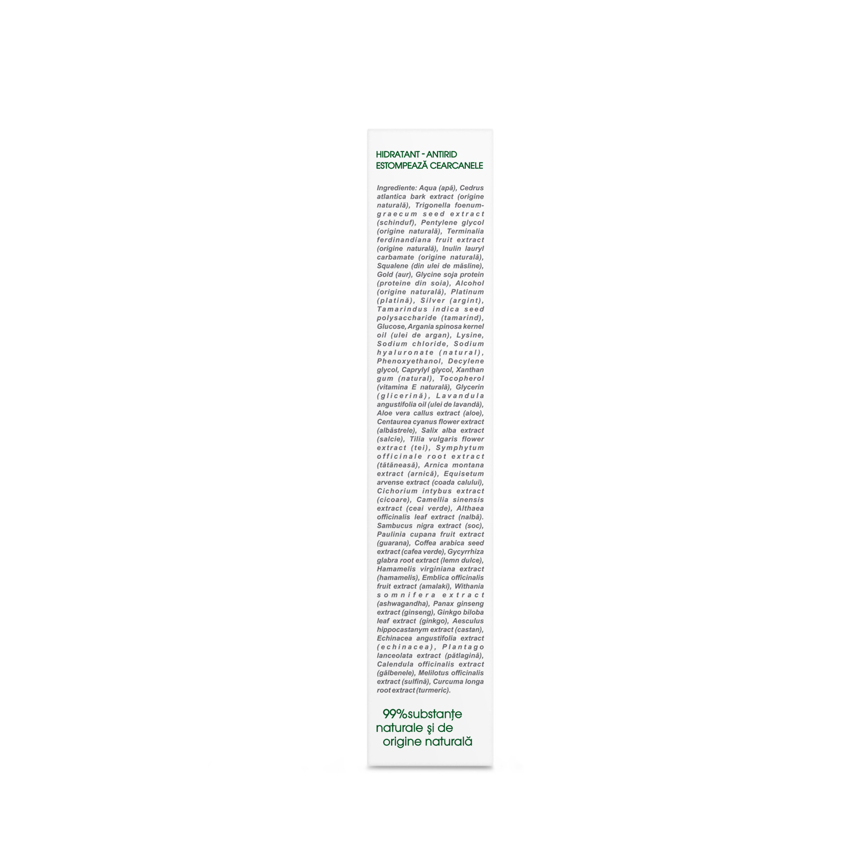 Aqua (apă), Cedrus atlantica bark extract (origine naturală), Trigonella foenum- graecum seed extract (schinduf), Pentylene glycol (origine naturală), Terminalia ferdinandiana fruit extract (origine naturală), Inulin lauryl carbamate (origine naturală), Squalene (din ulei de măsline), Gold (aur), Glycine soja protein (proteine din soia), Alcohol (origine naturală), Platinum (platină), Silver (argint), Tamarindus indica seed polysaccharide (tamarind), Glucose, Argania spinosa kernel oil (ulei de argan), Lysine, Sodium chloride, Sodium hyaluronate (natural), Phenoxyethanol, Decylene glycol, Caprylyl glycol, Xanthan gum (natural), Tocopherol (vitamina E naturală), Glycerin (glicerină), Lavandula angustifolia oil (ulei de lavandă), Aloe vera callus extract (aloe), Centaurea cyanus flower extract (albăstrele), Salix alba extract (salcie), Tilia vulgaris flower extract (tei), Symphytum officinale root extract (tǎtǎneasă), Arnica montana extract (arnică), Equisetum arvense extract (coada calului), Cichorium intybus extract (cicoare), Camellia sinensis extract (ceai verde), Althaea officinalis leaf extract (nalbă). Sambucus nigra extract (soc), Paulinia cupana fruit extract (guarana), Coffea arabica seed extract (cafea verde), Gycyrrhiza glabra root extract (lemn dulce), Hamamelis virginiana extract (hamamelis), Emblica officinalis fruit extract (amalaki), Withania somnifera extract (ashwagandha), Panax ginseng extract (ginseng), Ginkgo biloba leaf extract (ginkgo), Aesculus hippocastanym extract (castan), Echinacea angustifolia extract (echinacea), Plantago lanceolata extract (pătlagină), Calendula officinalis extract (gălbenele), Melilotus officinalis extract (sulfină), Curcuma longa root extract (turmeric).