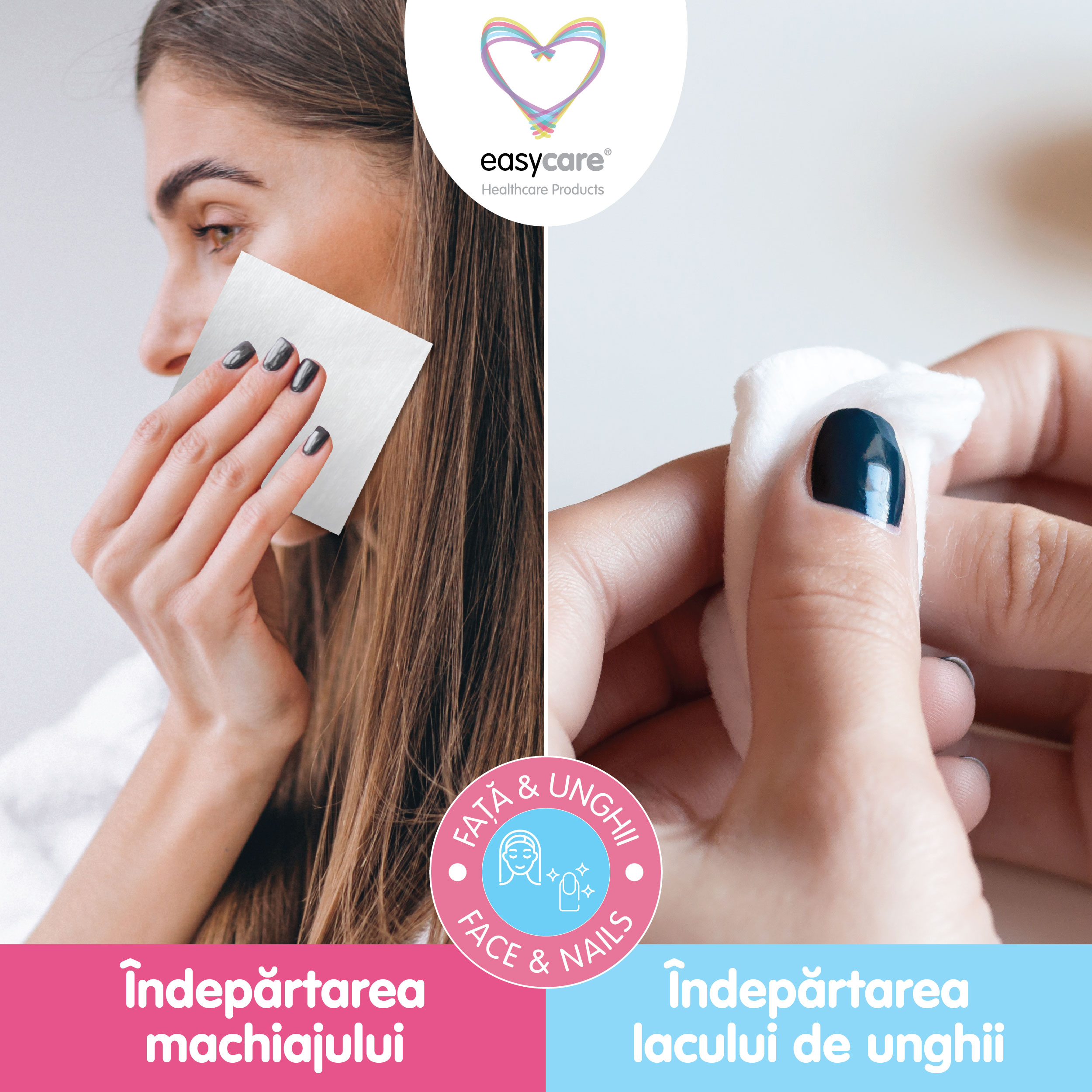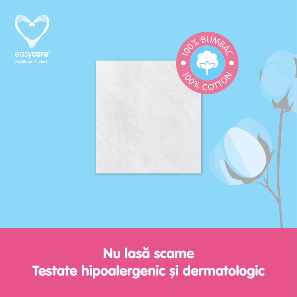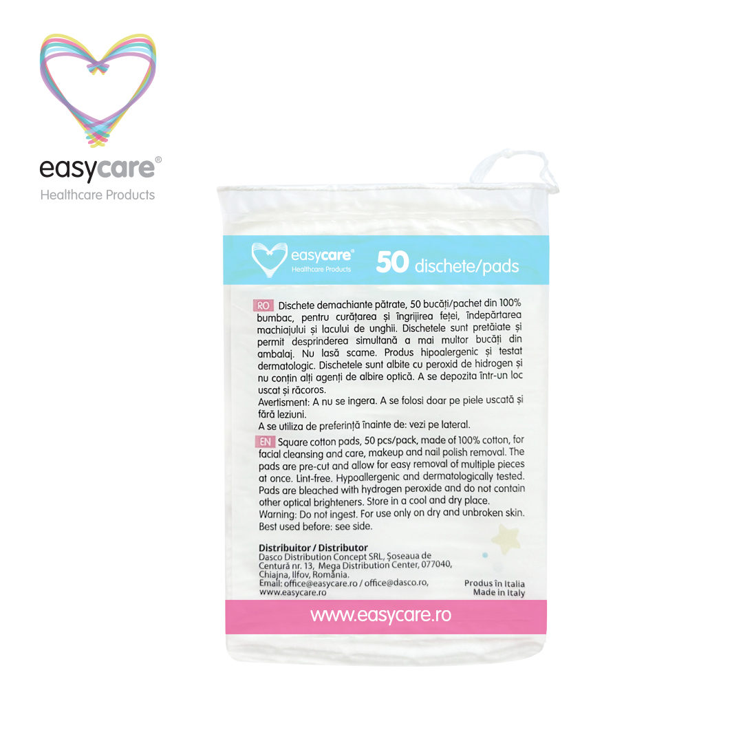 Dischetele demachiante patrate EASYCARE sunt realizate din bumbac moale si absorbant, concepute pentru o curatare delicata si eficienta a pielii. Cu dimensiunea de 8×7,5 cm, sunt perfecte pentru demachiere, aplicarea lotiunilor tonice sau a apei micelare. Nu lasa scame si sunt ideale pentru toate tipurile de ten, inclusiv cel sensibil.