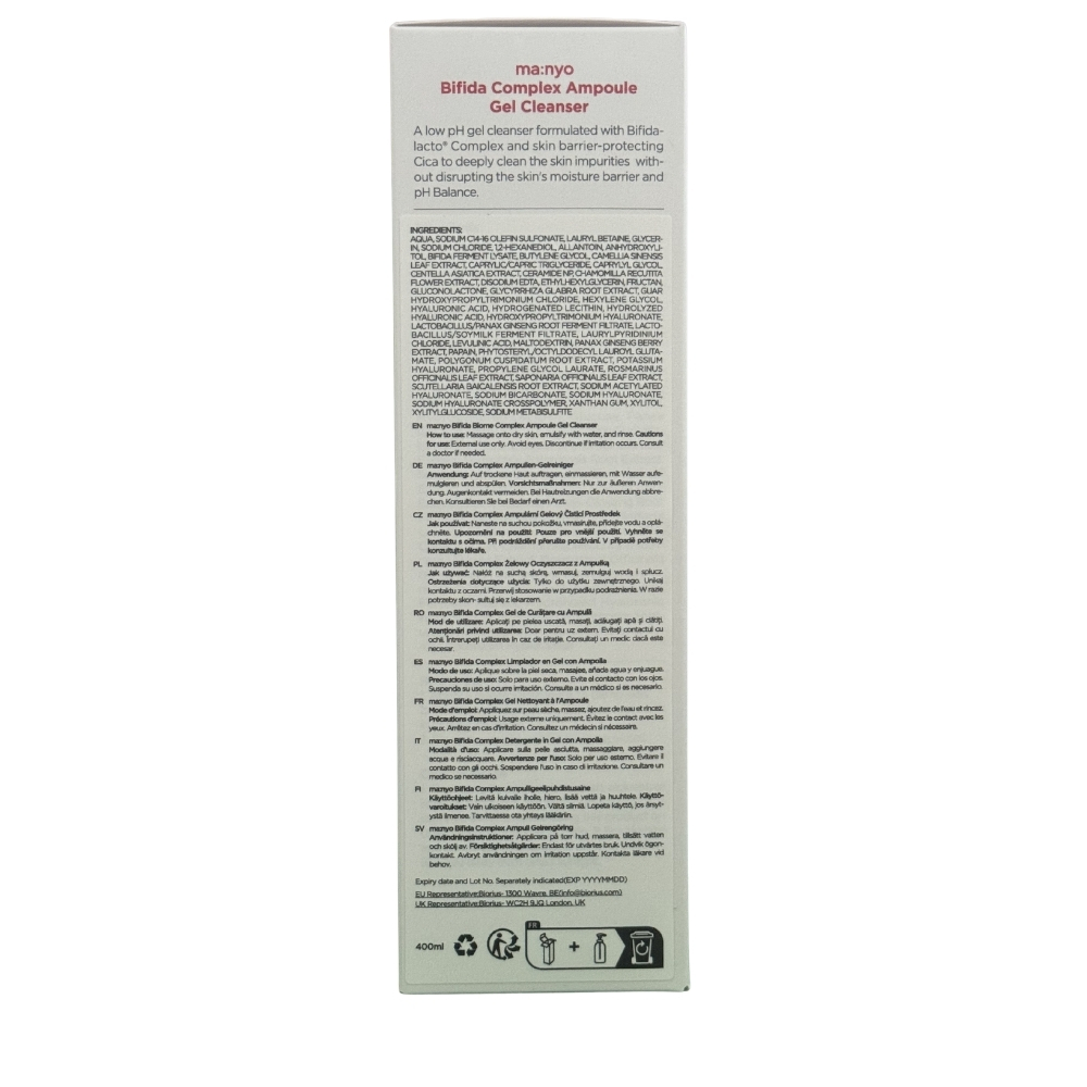 Descoperă gelul de curățare și îndepărtare a machiajului Bifida Complex Ampoule Gel Cleanser, formulat cu Complexul Bifidalacto® și acid hialuronic, potrivit chiar și pentru cel mai sensibil ten. Acest gel de curățare cu pH scăzut protejează bariera pielii și menține echilibrul optim al acesteia. Tehnologia micelară ajută la absorbția machiajului și impurităților, lăsând pielea curată și hidratată.