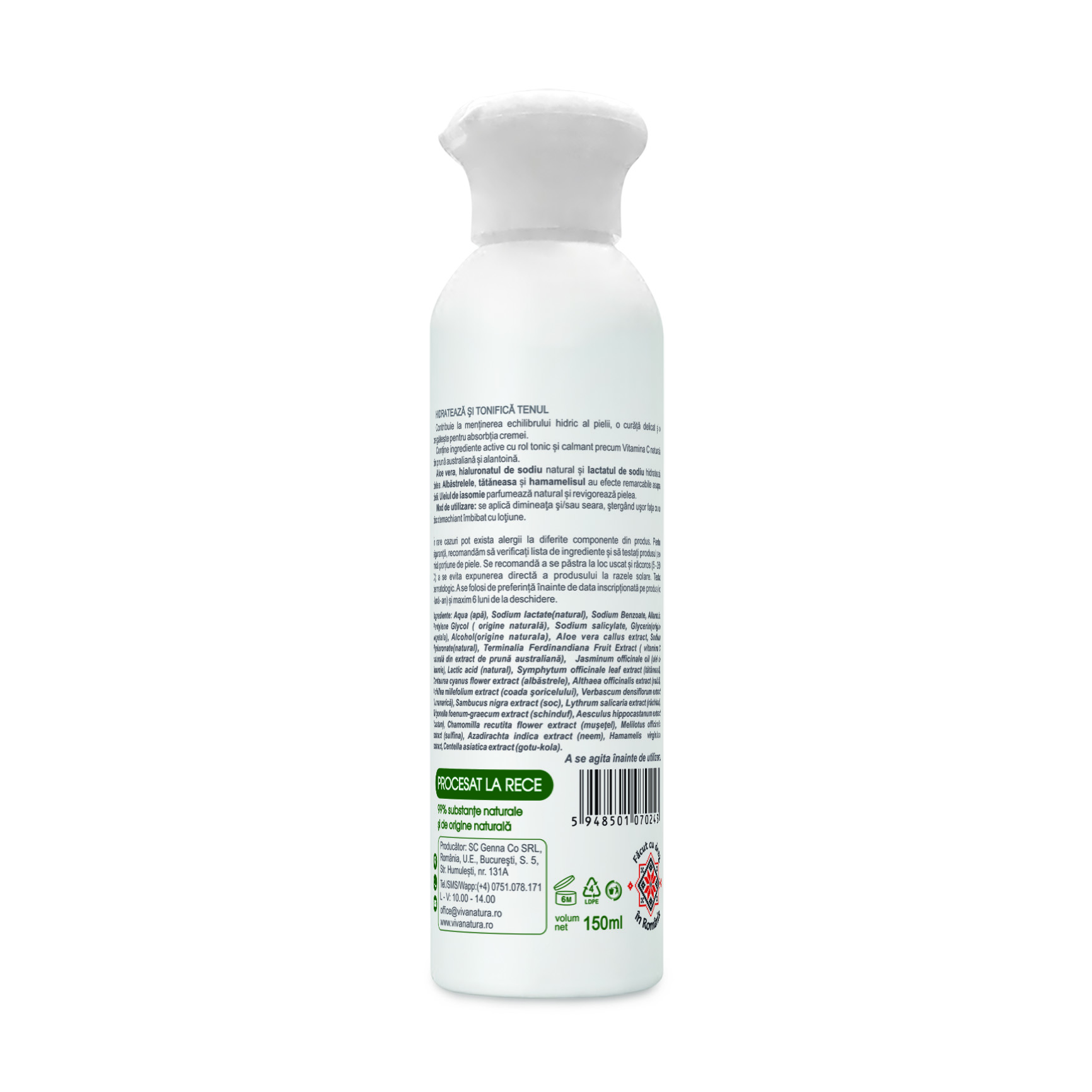 Aqua (apă), Sodium lactate(natural), Sodium Benzoate, Allantoin, Pentylene Glycol (origine naturală), Sodium salicylate, Glycerin (origine vegetala), Alcohol (origine naturala), Aloe vera callus extract, Sodium Hyaluronate(natural), Terminalia Ferdinandiana Fruit Extract (vitamina C naturală din extract de prună australiană), Jasminum officinale oil (ulei de iasomie), Lactic acid (natural), Symphytum officinale leaf extract (tǎtǎneasă), Centaurea cyanus flower extract (albăstrele), Althaea officinalis extract (nalbă), Achillea millefolium extract (coada şoricelului), Verbascum densiflorum extract (lumanarică), Sambucus nigra extract (soc), Lythrum salicaria extract (răchitan), Trigonella foenum-graecum extract (schinduf), Aesculus hippocastanum extract (castan), Chamomilla recutita flower extract (muşeţel), Melilotus officinalis extract (sulfina), Azadirachta indica extract (neem), Hamamelis virginiana extract, Centella asiatica extract (gotu-kola).
