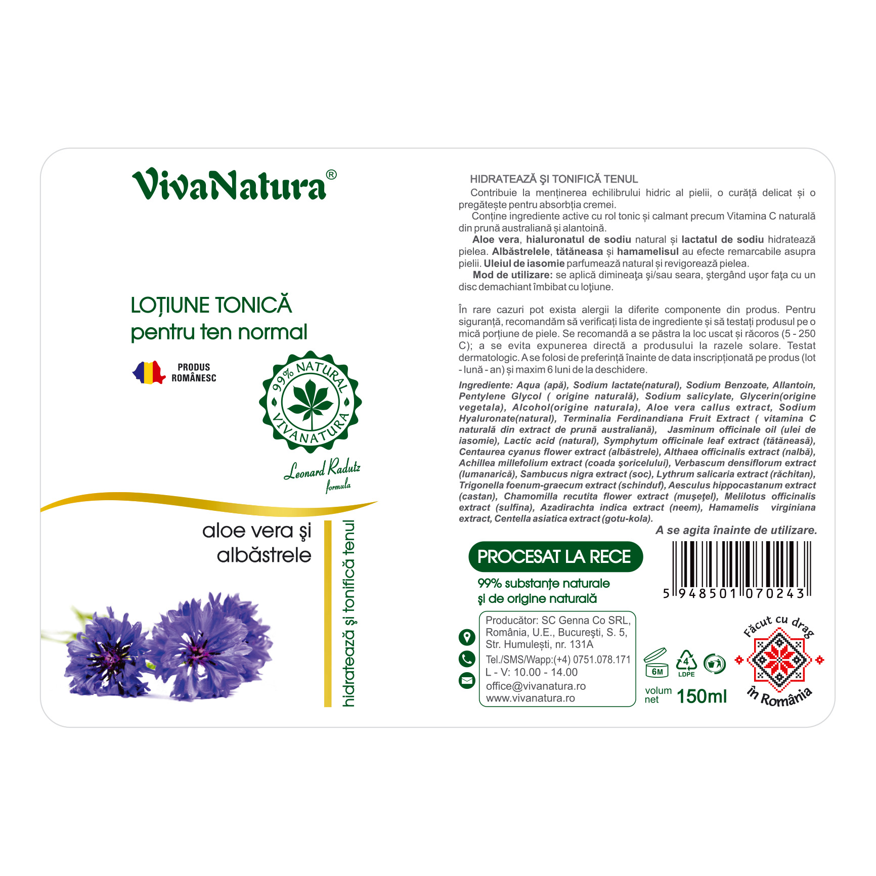 Lotiunea tonica cu aloe vera si albastrele contribuie la menținerea echilibrului hidric al pielii, o curăță delicat și o pregăteşte pentru absorbția cremei.