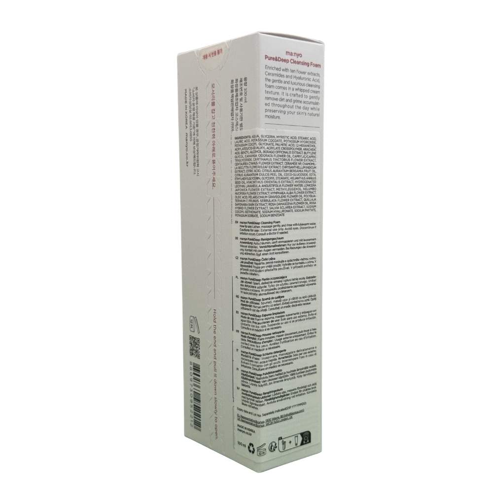 Pure & Deep Cleansing Foam de la ma:nyo este o spumă de curățare neiritantă, special concepută pentru a curăța în profunzime porii și a îmbunătăți aspectul acestora. Formula sa unică se bazează pe o serie de ingrediente naturale, acid hialuronic și ceramide, care ajută la menținerea hidratării pielii chiar și după curățare. Produsul este ideal pentru tenul normal, uscat sau sensibil, fiind eficient împotriva porilor dilatați sau înfundați.
