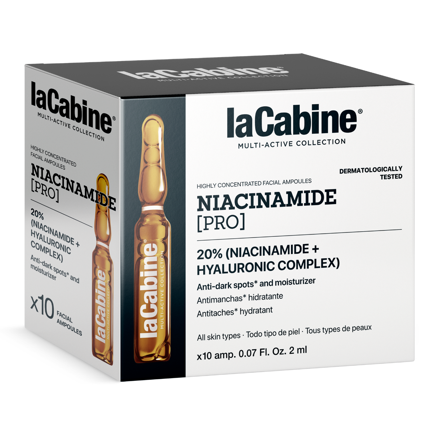 Fiolele faciale laCabine Niacinamide PRO sunt fiole puternic concentrate cu 20% Niacinamide + Hyaluronic Complex, concepute pentru a ajuta la uniformizarea tonului pielii, la reducerea petelor pigmentare și la oferirea unui aspect luminos și hidratat al tenului. Potrivite pentru toate tipurile de piele, inclusiv pentru tenul tern sau deshidratat.