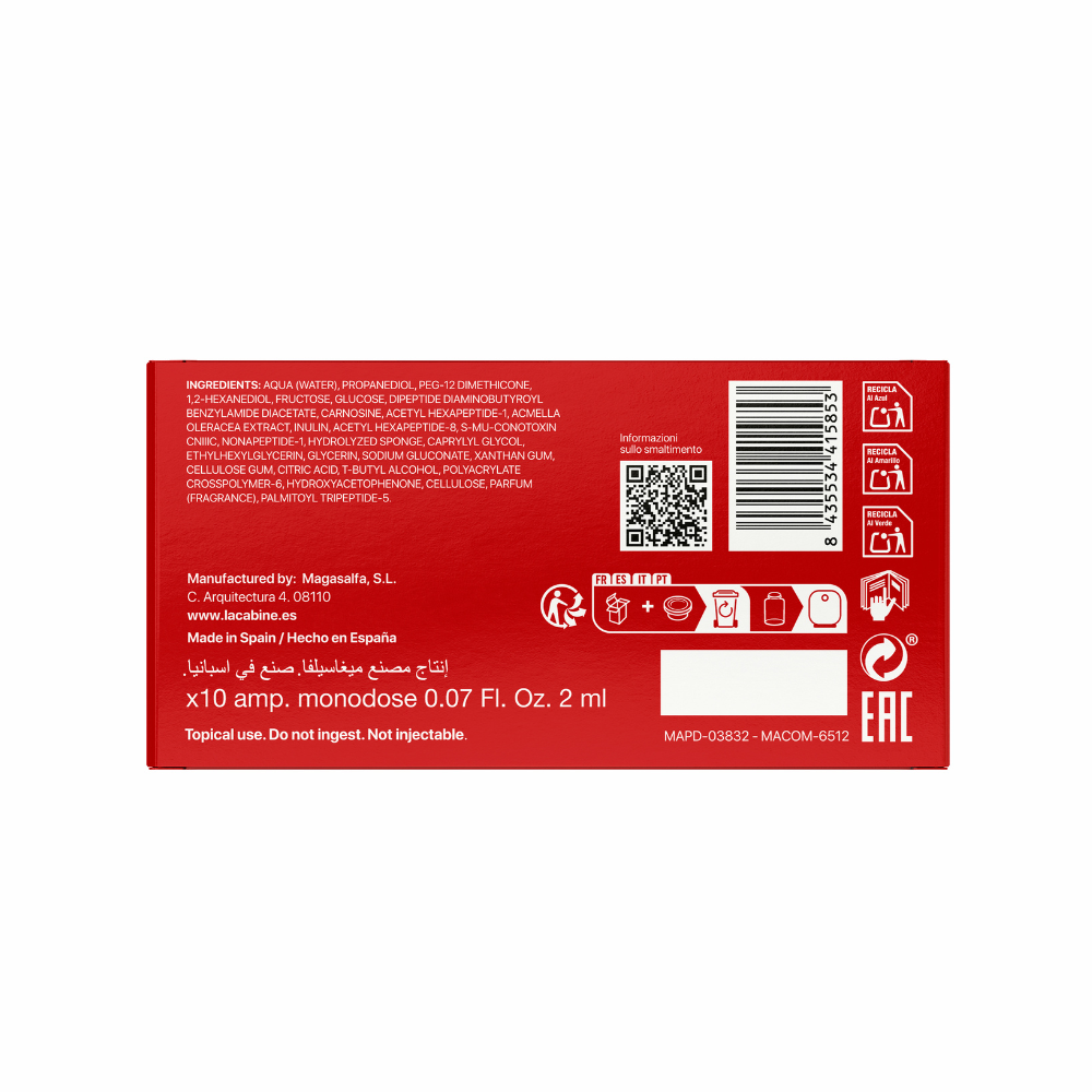 Aqua (Water), Propanediol, PEG-12 Dimethicone, 1,2-Hexanediol, Fructose, Glucose, Dipeptide Diaminobutyroyl Benzylamide Diacetate, Carnosine, Acetyl Hexapeptide-1, Acmella Oleracea Extract, Inulin, Acetyl Hexapeptide-8, S-Mu-Conotoxin Cniiic, Nonapeptide-1, Hydrolyzed Sponge, Caprylyl Glycol, Ethylhexylglycerin, Glycerin, Sodium Gluconate, Xanthan Gum, Cellulose Gum, Citric Acid, T-Butyl Alcohol, Polyacrylate Crosspolymer-6, Hydroxyacetophenone, Cellulose, Parfum (Fragrance), Palmitoyl Tripeptide-5
