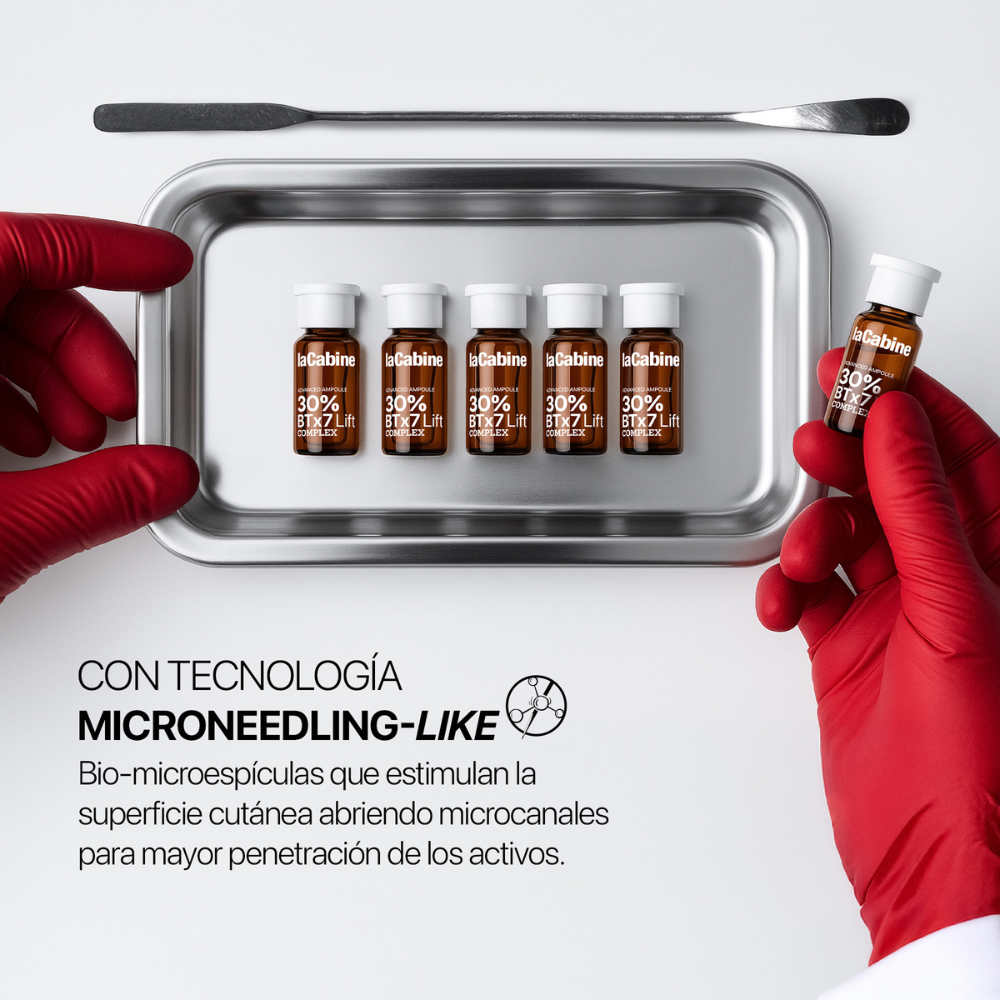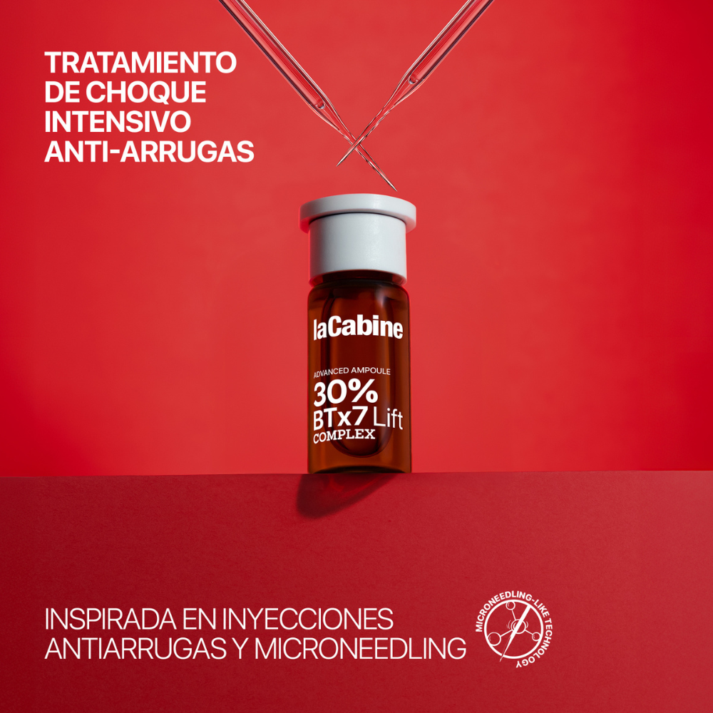 Fiole pentru față laCabine BTx7 Lift 30%, tratament intensiv de 10 zile cu 7 peptide și tehnologie microneedling-like, conceput pentru a susține reducerea ridurilor și îmbunătățirea fermității pielii. Formula concentrată ajută la netezirea liniilor fine, la uniformizarea texturii pielii și la obținerea unui aspect mai luminos și revitalizat.