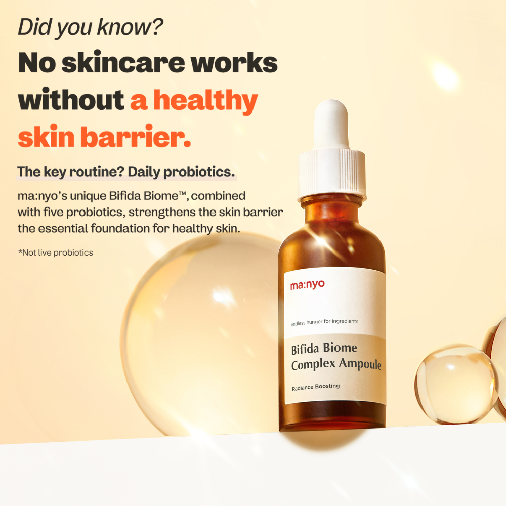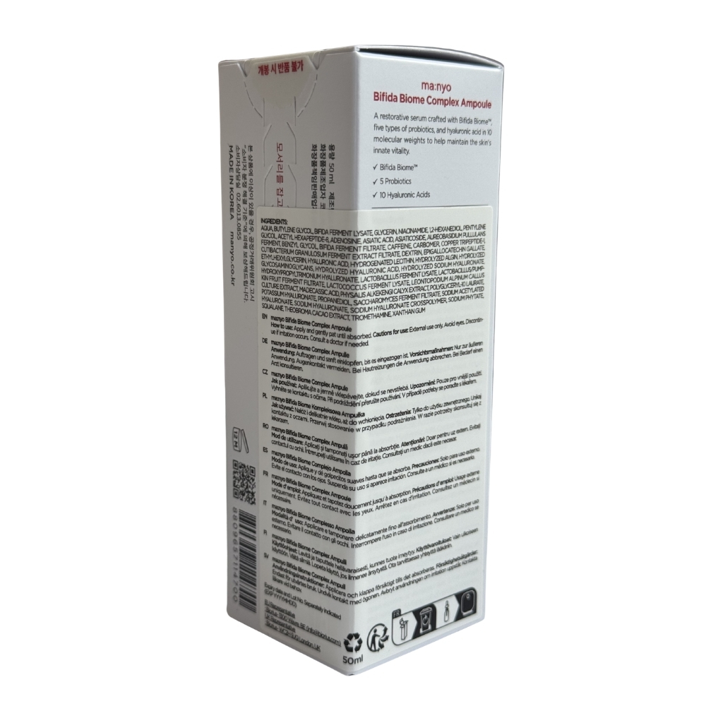 Manyo Bifida Complex Ampoule este un ser concentrat anti-aging, creat pentru refacerea barierei cutanate si imbunatatirea aspectului general al pielii. Formula sa avansata combina complexul brevetat Bifida Biome™ cu 5 tipuri de probiotice, peptide si 10 tipuri de acid hialuronic, pentru o actiune completa de hidratare, regenerare si protectie.