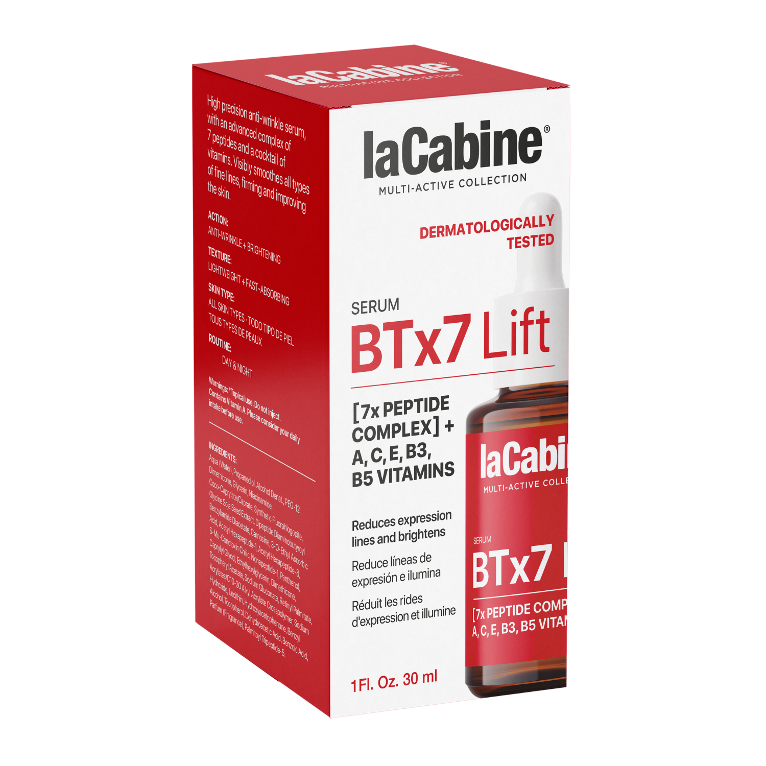 Serum pentru față laCabine BTx7 Lift, formulat cu 7x Peptide Complex și un cocktail de vitamine A, C, E, B3 și B5, conceput pentru a ajuta la netezirea liniilor de expresie, la îmbunătățirea fermității pielii și la susținerea unui aspect mai luminos și revitalizat al tenului. Potrivit pentru toate tipurile de ten.