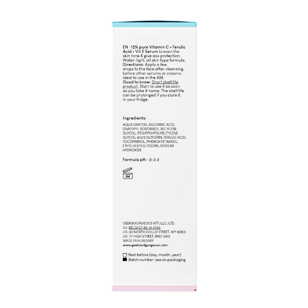 Formula super usoara, textura apoasa cu continut de 15% de Vitamina C pura + extra antioxidanti (Acid Ferulic si Vitamina E).