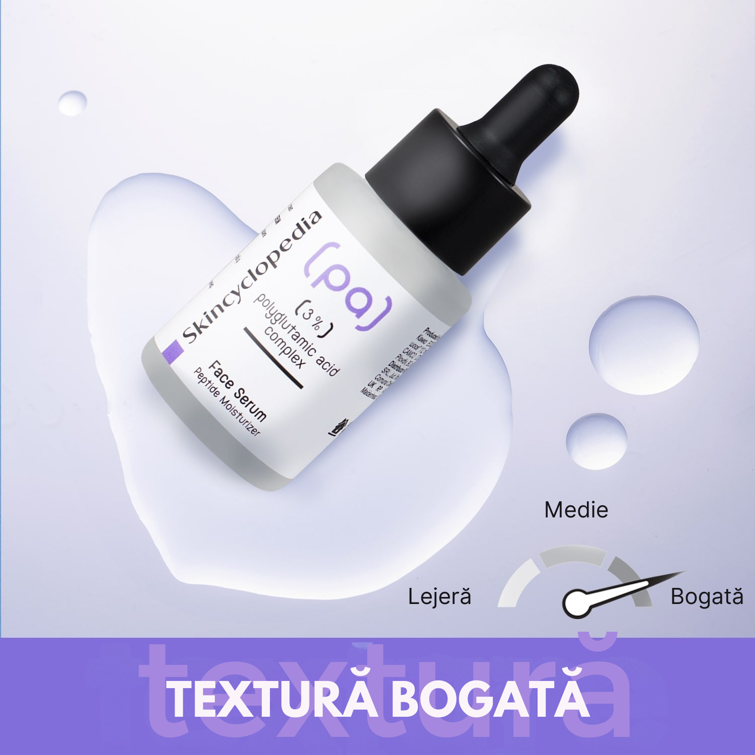 Descoperă Skincyclopedia Ser față cu 3% Acid Poliglutamic, formulă intens hidratantă ce oferă luminozitate, fermitate și netezire vizibilă. Potrivit tuturor tipurilor de ten, chiar și celor sensibile. Textură ușoară, absorbție rapidă, fără parfum sau uleiuri esențiale.