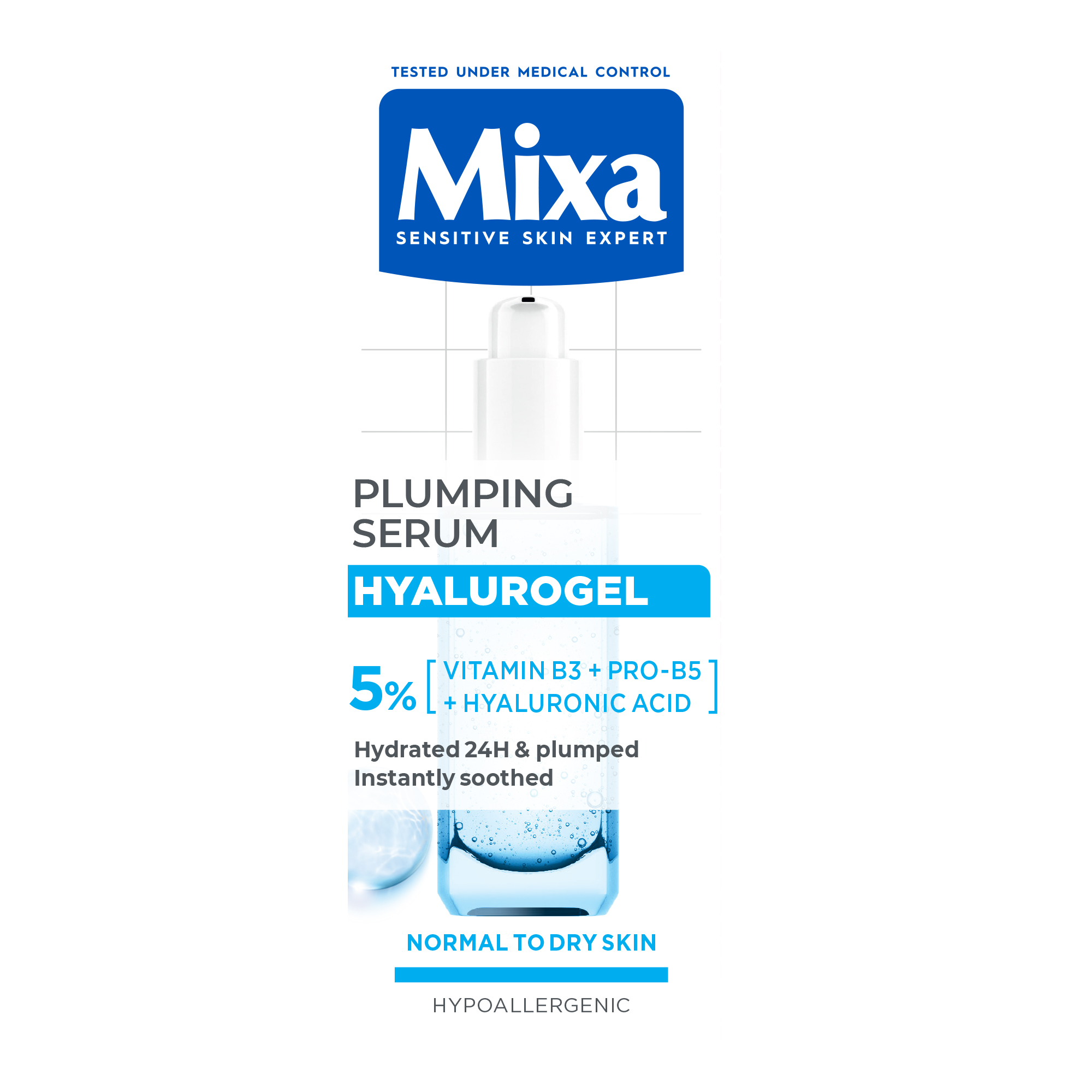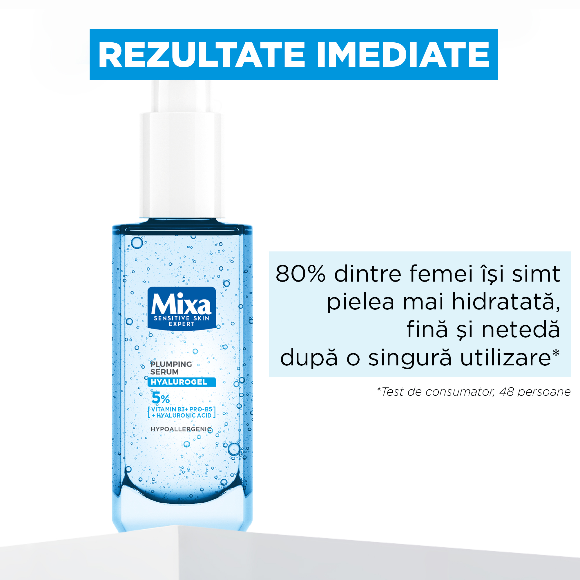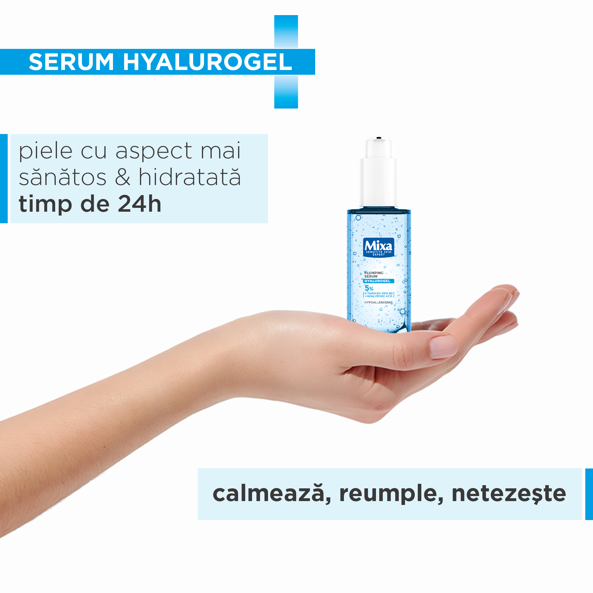 Ser concentrat cu 5% vitamina B3, provitamina B5 și acid hialuronic pur, special formulat pentru pielea sensibilă. Oferă calmare imediată, hidratare timp de 24 de ore și contribuie la un aspect mai neted și mai plin al pielii.