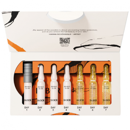 Babor Vitamin Glow combină 4 fiole Perfect Glow cu 3 fiole Multi-Vitamin pentru un efect vizibil de piele luminoasă și uniformă în doar 7 zile. Pigmenții optici și exopolizaharidele conferă glow imediat, în timp ce complexul multi-vitaminic (retinol, vitamina C, E, B3, biotină) fortifică bariera cutanată, netezește textura și revitalizează tenul obosit sau tern.