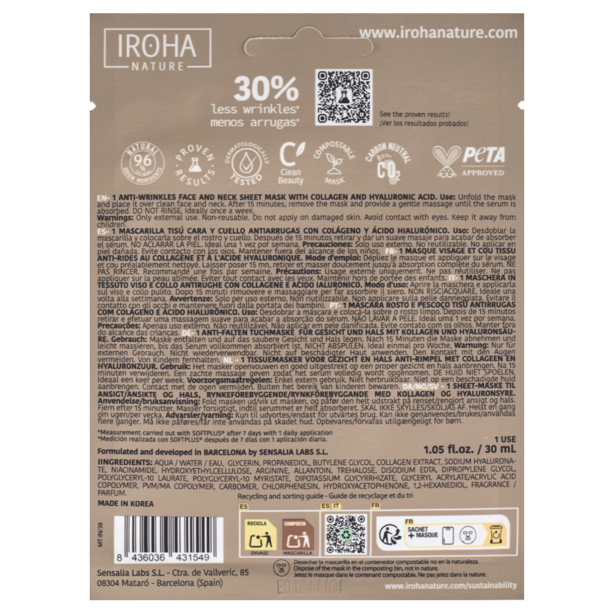 Masca faciala imbogatita cu colagen si acid hialuronic ofera un tratament intensiv de hidratare si revitalizare a pielii. Formula sa concentrata, cu 30 ml de serum, actioneaza rapid pentru a reda elasticitatea si luminozitatea tenului, oferind un efect vizibil chiar dupa prima utilizare. Textura usoara permite absorbtia eficienta a ingredientelor active, contribuind la imbunatatirea aspectului general al pielii in doar 15 minute. Este ideala pentru momentele in care tenul are nevoie de un boost rapid de ingrijire, lasand pielea neteda, hidratata si revitalizata.