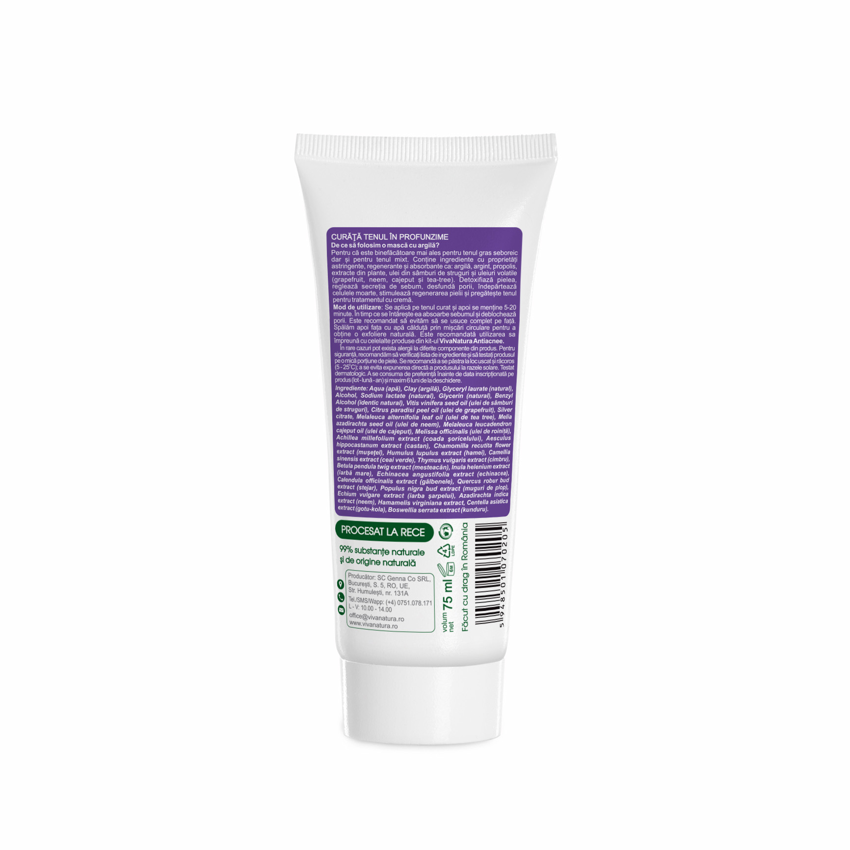 Aqua (apă), Clay (argilă), Glyceryl laurate (natural), Alcohol, Sodium lactate (natural), Glycerin (natural), Benzyl Alcohol (identic natural), Vitis vinifera seed oil (ulei de sâmburi de struguri), Citrus paradisi peel oil (ulei de grapefruit), Silver citrate, Melaleuca alternifolia leaf oil (ulei de tea tree), Melia azadirachta seed oil (ulei de neem), Melaleuca leucadendron cajeput oil (ulei de cajeput), Melissa officinalis (ulei de roiniță), Achillea millefolium extract (coada şoricelului), Aesculus hippocastanum extract (castan), Chamomilla recutita flower extract (muşetel), Humulus lupulus extract (hamei), Camellia sinensis extract (ceai verde), Thymus vulgaris extract (cimbru), Betula pendula twig extract (mesteacăn), Inula helenium extract (iarbă mare), Echinacea angustifolia extract (echinacea), Calendula officinalis extract (gălbenele), Quercus robur bud extract (stejar), Populus nigra bud extract (muguri de plop), Echium vulgare extract (iarba şarpelui), Azadirachta indica extract (neem), Hamamelis virginiana extract, Centella asiatica extract (gotu-kola), Boswellia serrata extract (kunduru).