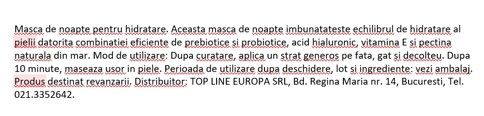 Aplicati un strat generos pe fata, gat si decolteu, de 1–2 ori pe saptamana, preferabil seara, dupa curatarea tenului. Evitati zona ochilor. Lasati sa actioneze 10 minute, apoi masati excesul ramas si lasati produsul sa actioneze peste noapte.