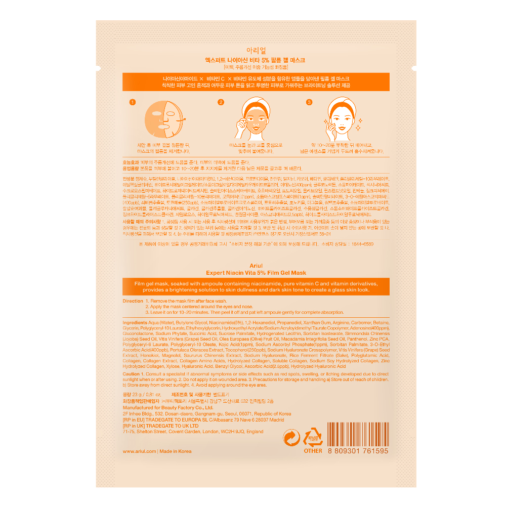 Ariul Expert Niacin Vita 5% este o mască hidrogel iluminatoare, concepută pentru a oferi pielii hidratare intensă și un efect imediat de strălucire. Formula sa concentrată combină ingrediente active puternice precum niacinamida 5%, vitamina C și acidul kojic, contribuind la uniformizarea nuanței pielii și la reducerea aspectului petelor pigmentare.
