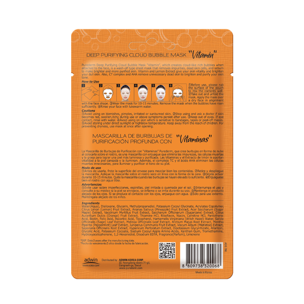 Purederm Oxygen Bubble Mask este o mască șervețel de tip wash-off, care se transformă la aplicare într-o spumă bogată cu efect purifiant și revitalizant. Formula sa inovatoare, îmbogățită cu Complex CT și AHA naturali, ajută la eliminarea impurităților, a celulelor moarte și a excesului de sebum, redând pielii un aspect curat, uniform și luminos.