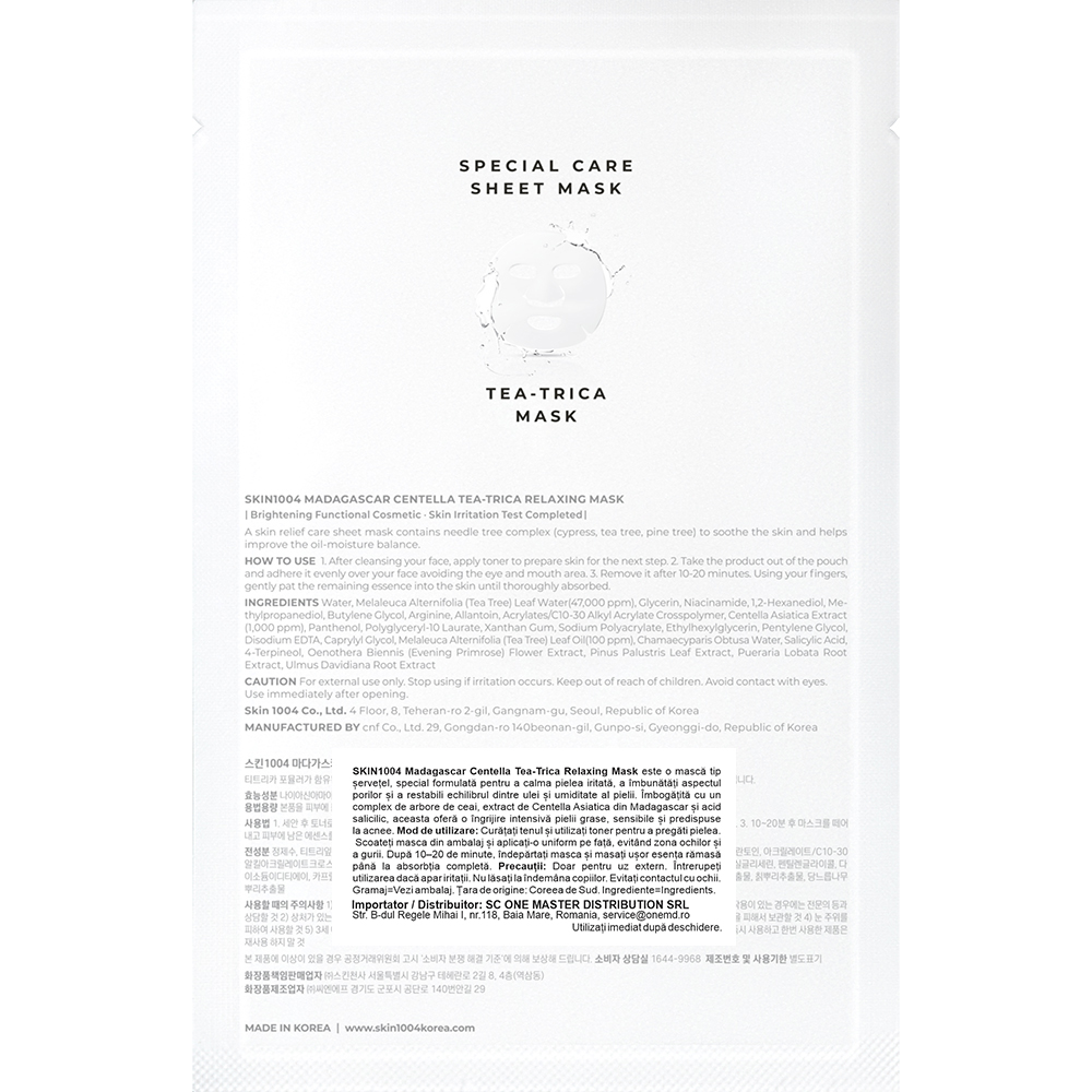 Masca tip șervețel SKIN1004 Madagascar Centella Tea-Trica Relaxing Mask oferă un tratament intensiv pentru pielea grasă, mixtă sau sensibilă, predispusă la acnee. Formula sa este îmbogățită cu extract de frunză de arbore de ceai, Centella Asiatica din Madagascar și acid salicilic (BHA), ingrediente recunoscute pentru proprietățile lor calmante, purifiante și echilibrante. Textura ușoară și răcoritoare a esenței se absoarbe rapid, lăsând pielea curată, reîmprospătată și echilibrată.