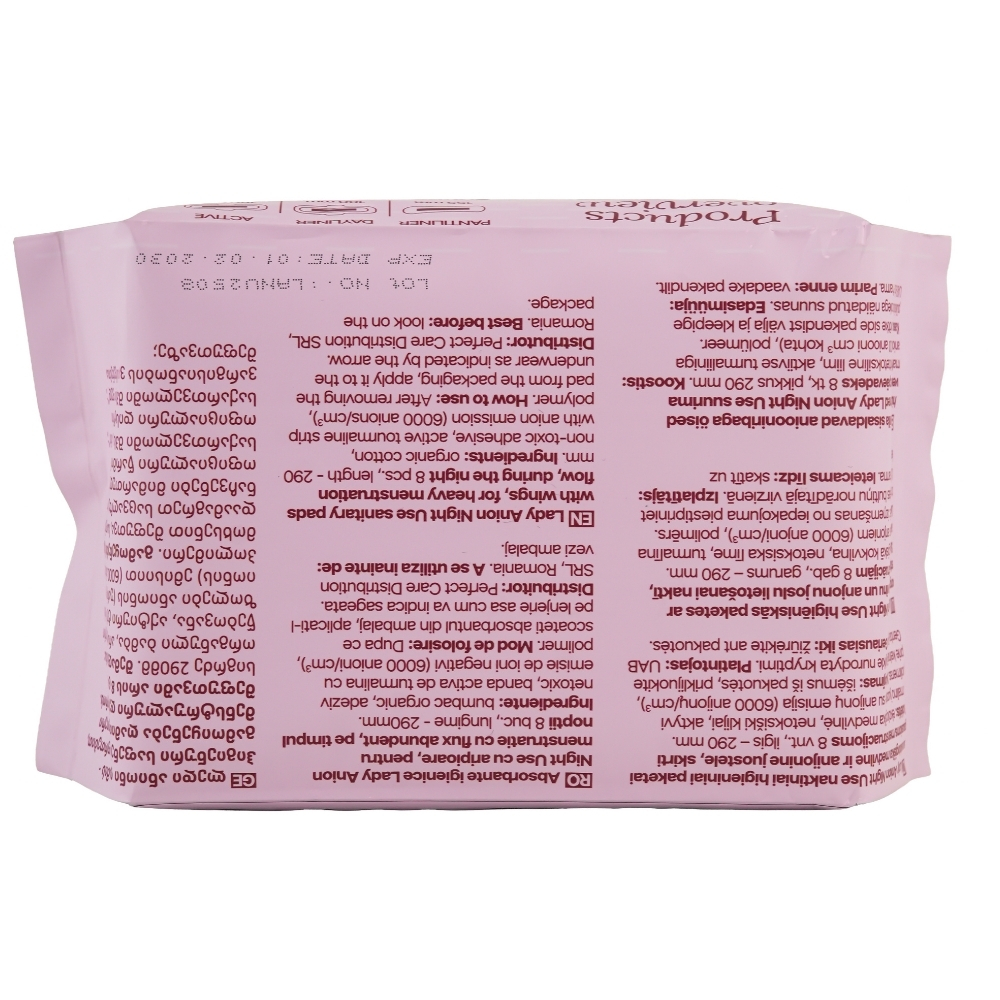 Absorbantele igienice Lady Anion Night Use 290 mm sunt special concepute pentru protecție maximă pe timpul nopții, fiind ideale pentru flux abundent. Oferă siguranță, confort și prospețime, datorită materialelor de calitate și tehnologiei cu ioni negativi.