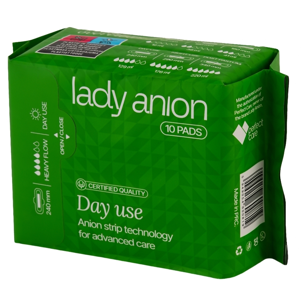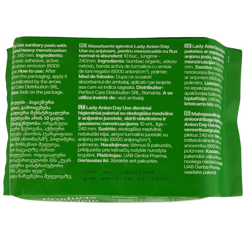 Absorbantele igienice Lady Anion Day Use 240 mm sunt special concepute pentru protecție eficientă în timpul menstruației, fiind potrivite pentru flux normal și abundent. Oferă confort și siguranță pe parcursul întregii zile, datorită materialelor de calitate și tehnologiei cu ioni negativi.