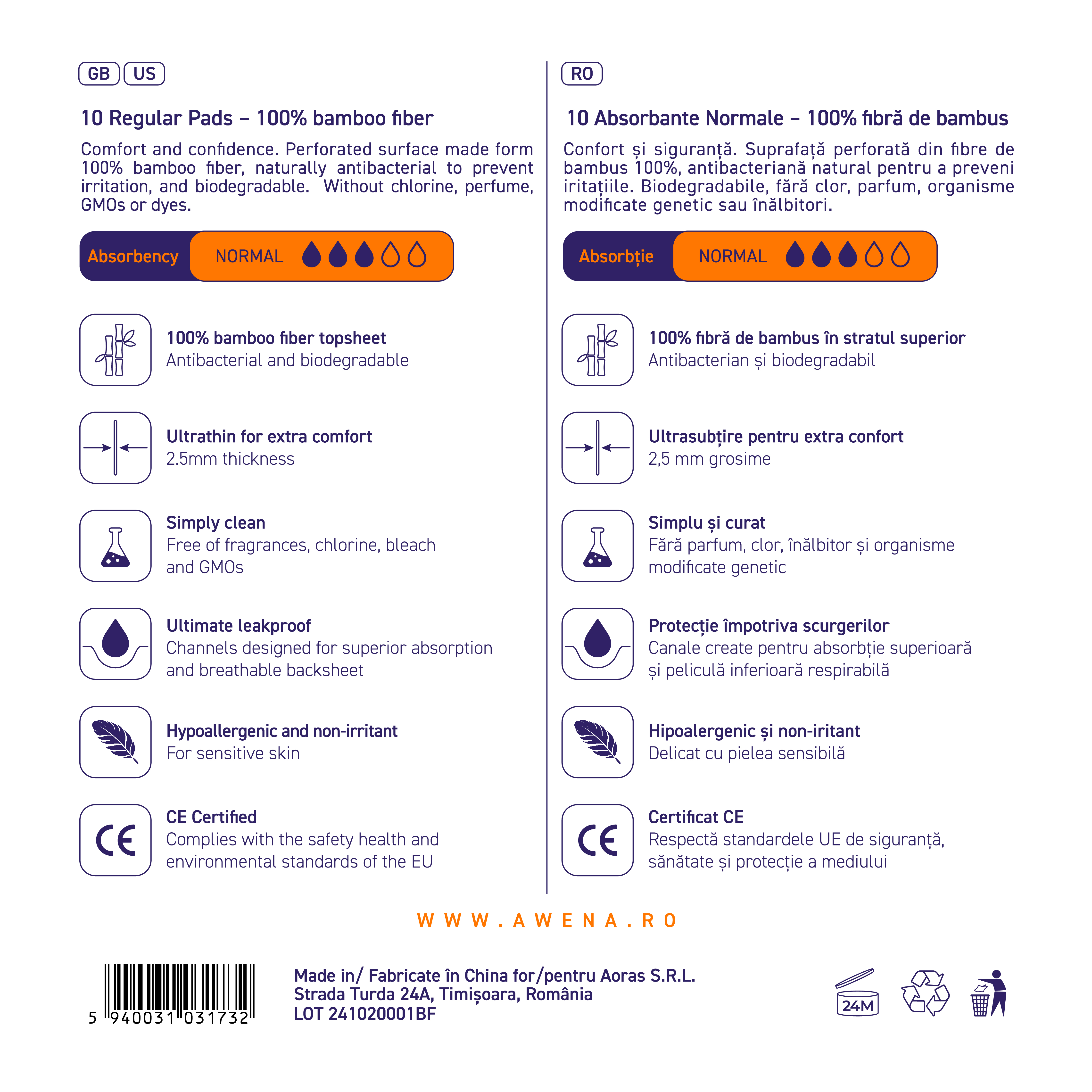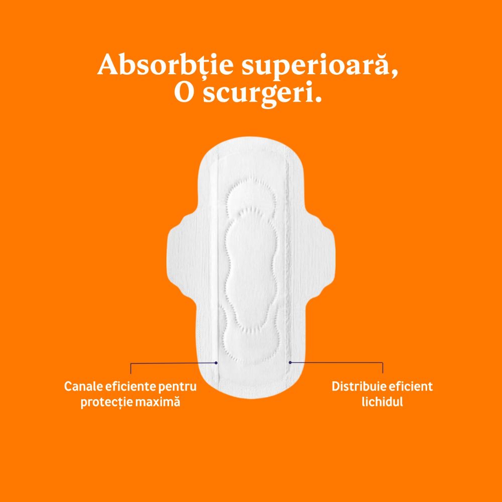Desprinde folia protectoare, fixeaza absorbantul pe lenjerie si pliaza aripioarele sub material pentru o stabilitate perfecta. Schimba absorbantul la fiecare 4 ore sau ori de cate ori este nevoie.
