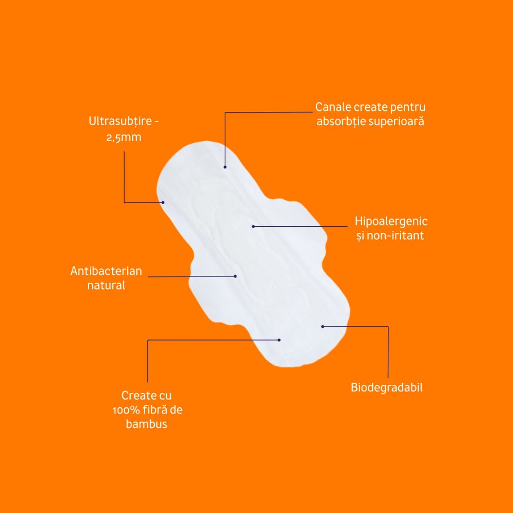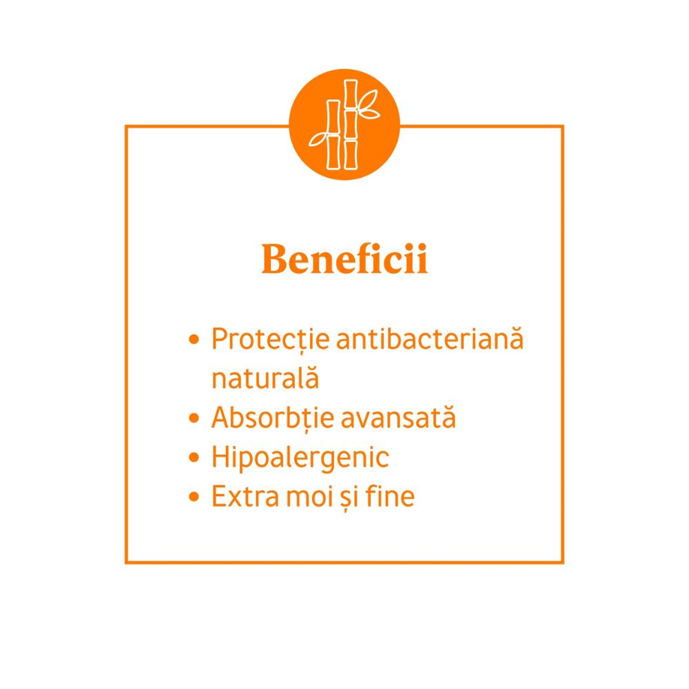 - Fibra de bambus organic are proprietati antibacteriene naturale, reducand riscul de infectii si iritatii.