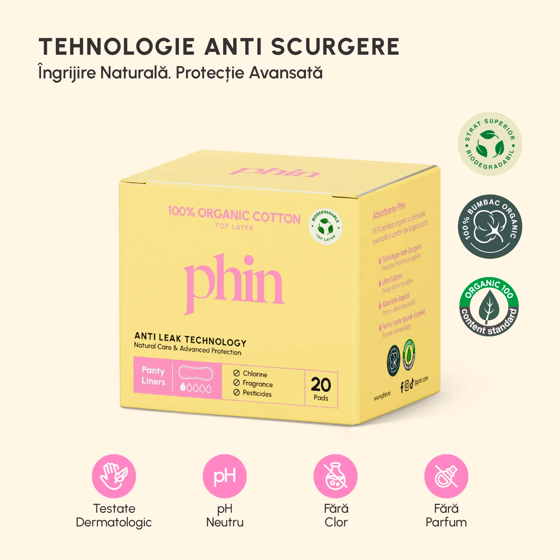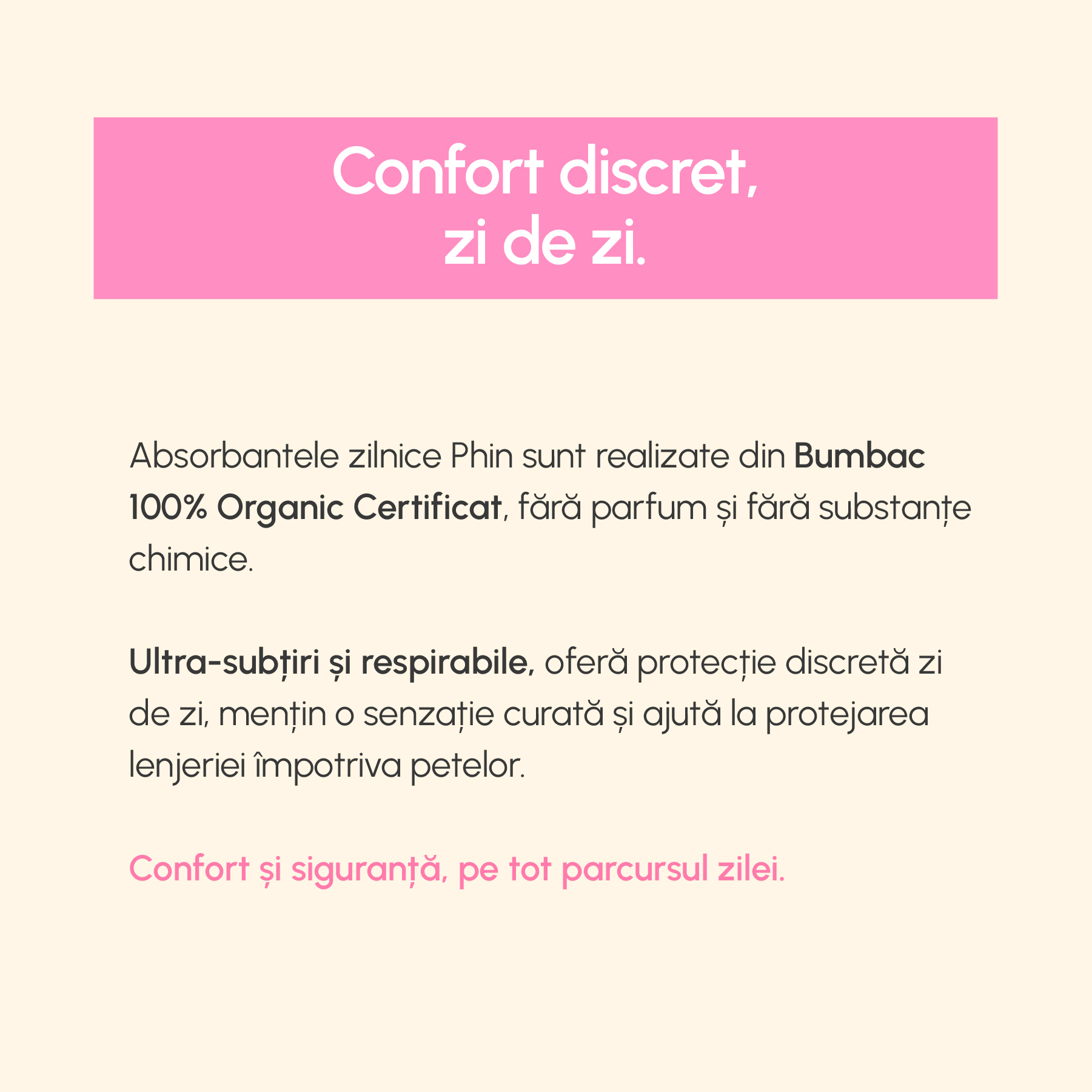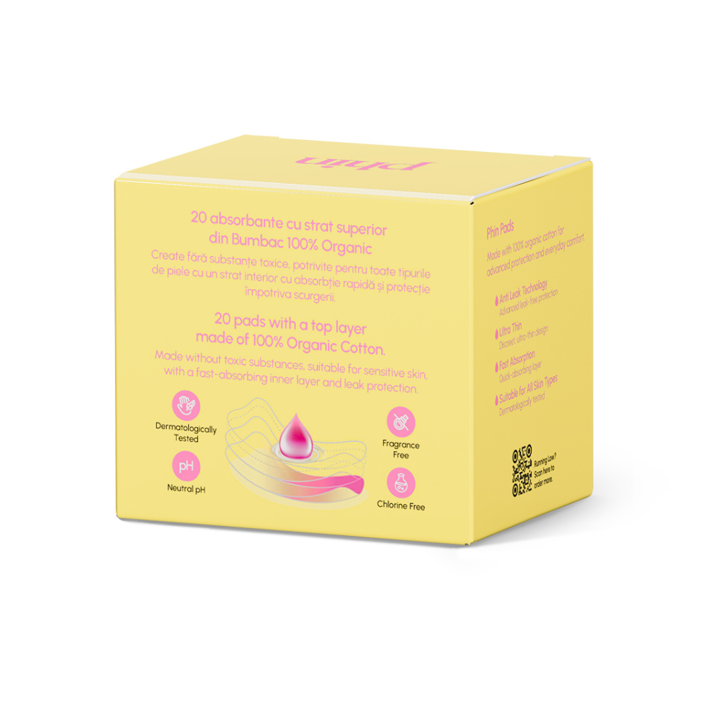Absorbante zilnice din bumbac organic Phin, 20 bucati sunt concepute pentru confort zilnic si protectie discreta. Stratul superior realizat din 100% bumbac organic este delicat cu pielea si potrivit pentru utilizare zilnica, inclusiv pentru piele sensibila. Absorbantele sunt ultra fine si ultra subtiri, oferind protectie la inceputul sau sfarsitul menstruatiei ori ca strat suplimentar de siguranta alaturi de tampoane.