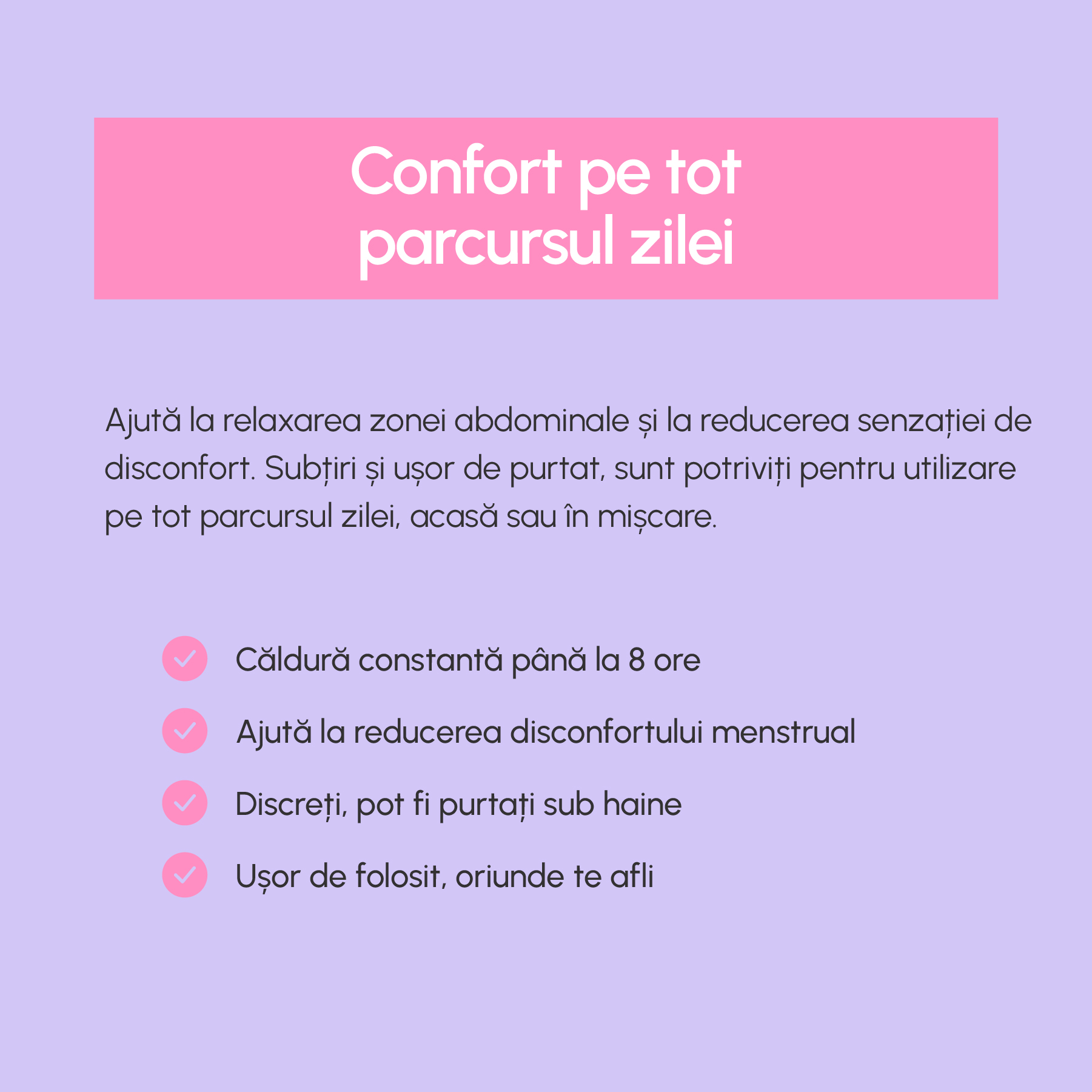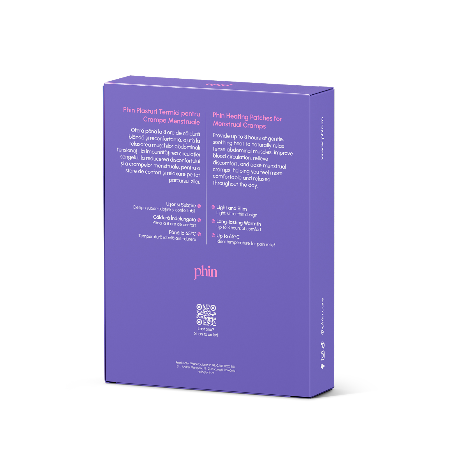 Plasturi termici pentru crampe menstruale Phin, 3 bucati ofera caldura delicata si constanta pentru ameliorarea disconfortului abdominal din perioada menstruatiei. Datorita designului ultra subtire si discret, plasturii pot fi purtati confortabil sub haine, acasa sau in timpul activitatilor zilnice. Caldura naturala ajuta la relaxarea muschilor si imbunatatirea circulatiei, contribuind la reducerea crampelor menstruale.